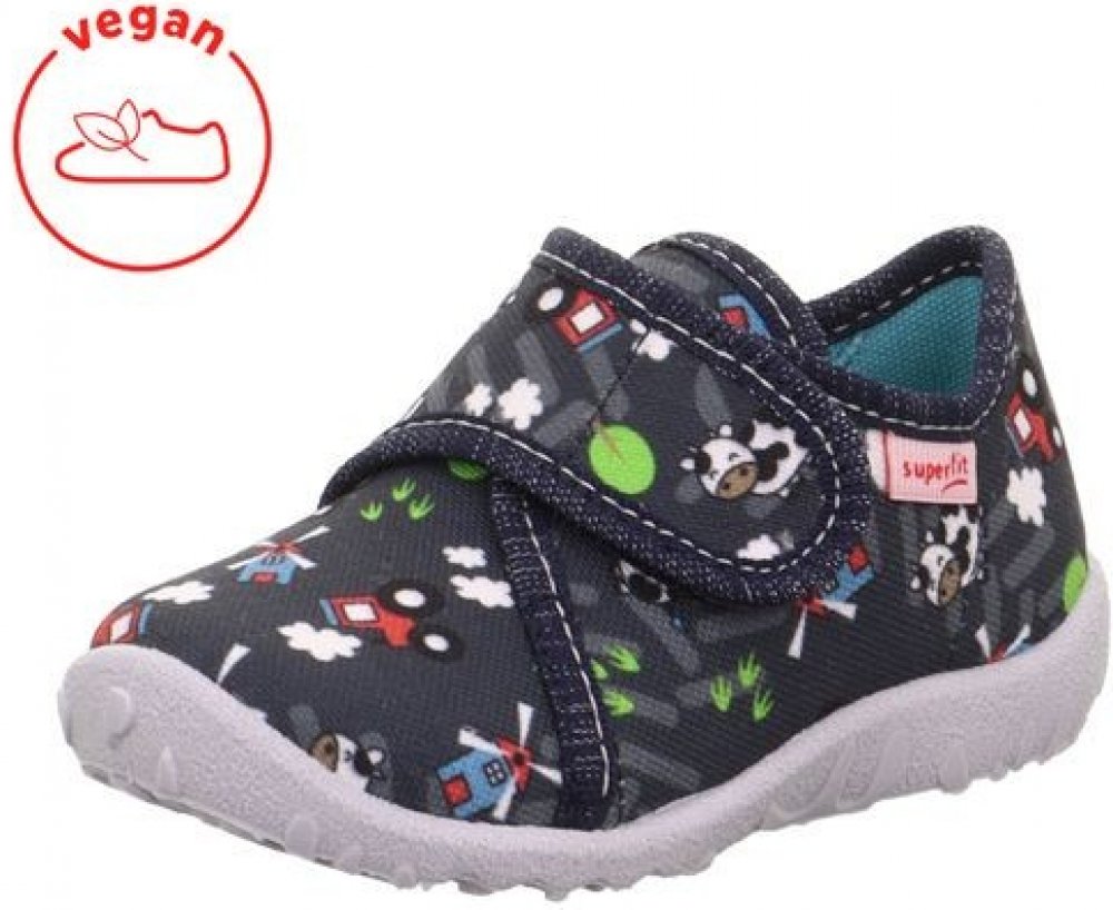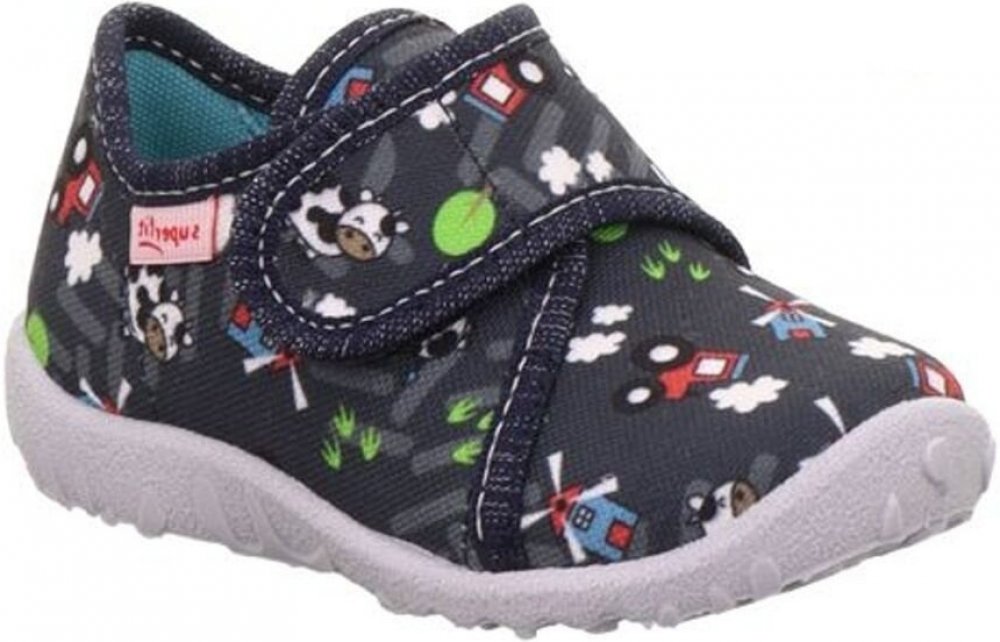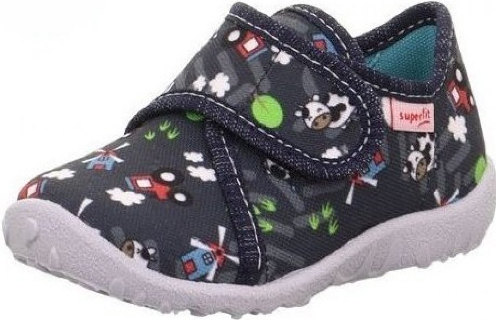 Chlapecké bačkory Superfit Spotty Blau/ Mehrfarbig 1-009246-8170 v tmavě modré - černé barvě s traktory a kravičkami.