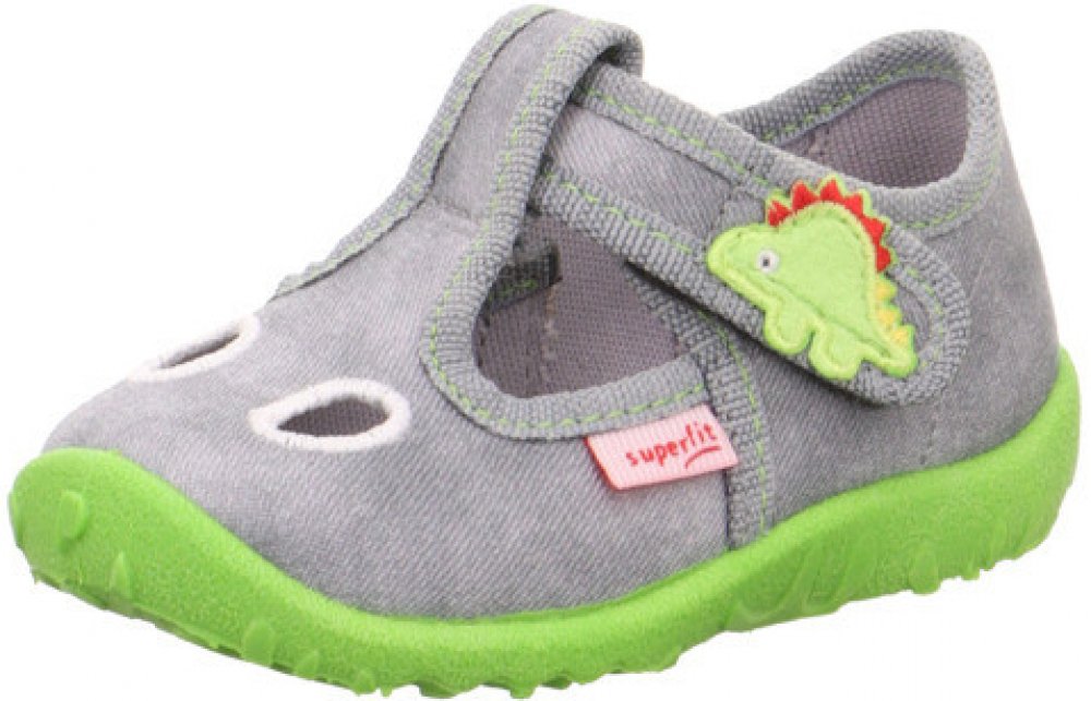 Dětské bačkory Superfit Spotty 1-009248-2500 v šedé barvě s limetkově zelenou podrážkou a motivem dráčka. V nártové části mají dva praktické otvory pro lepší prodyšnost.