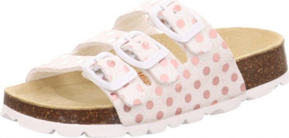Dívčí korkové pantofle FOOTBAD, Superfit ,1-800113-1080, bílá s růžovími puntiky. Ať už doma, ve školce nebo ve škole: skvělý superfit FOOTBAD s odolnou syntetickou kůží zvládne vše. Pantofle s módním designem se stejně dobře hodí i ven jako sandály. Pohodlná tvarovaná stélka boty je potažená kůží a nabízí skvělé klima pro nohu. Přilnavá podrážka navíc poskytuje dokonalé pohodlí při chůzi.