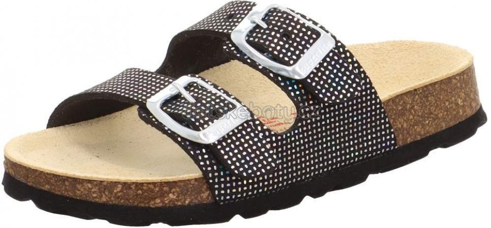 Nazouvací přezůvky značky Superfit, anatomicky tvarovaná kožená stélka na korkovém podkladu, nebarvící protiskluzná podešev, možnost upravit šířku sponami. Nazouváky jsou velmi lehké.