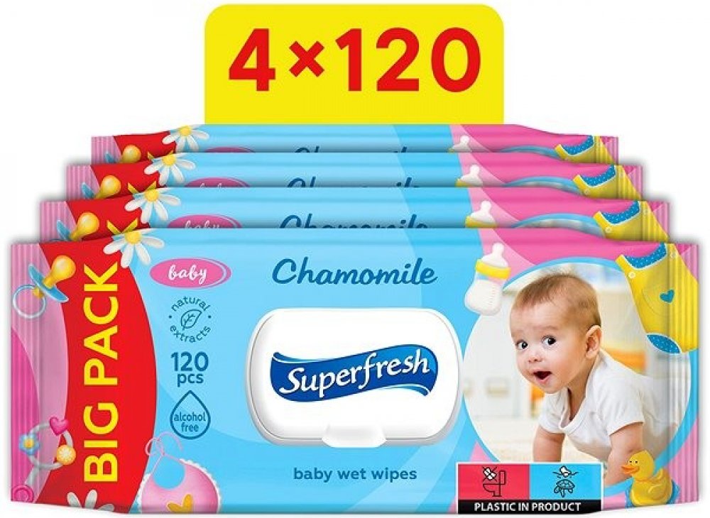 Dětské vlhčené ubrousky Superfresh s heřmánkem příjemně voní. Mezi plusy těchto ubrousků patří, že neobsahují alkohol, a tak se nemusíte strachovat z podráždění pokožky. Můžete s nimi otřít celé tělo, protože se mohou pochlubit neutrálním pH. Spolehlivě poslouží i dětem s citlivou pokožkou. Rostlinné výtažky doplní pokožku o maximální pohodlí a bezpečí. V balení najdete 4× 120 ks vlhčených ubrousk...