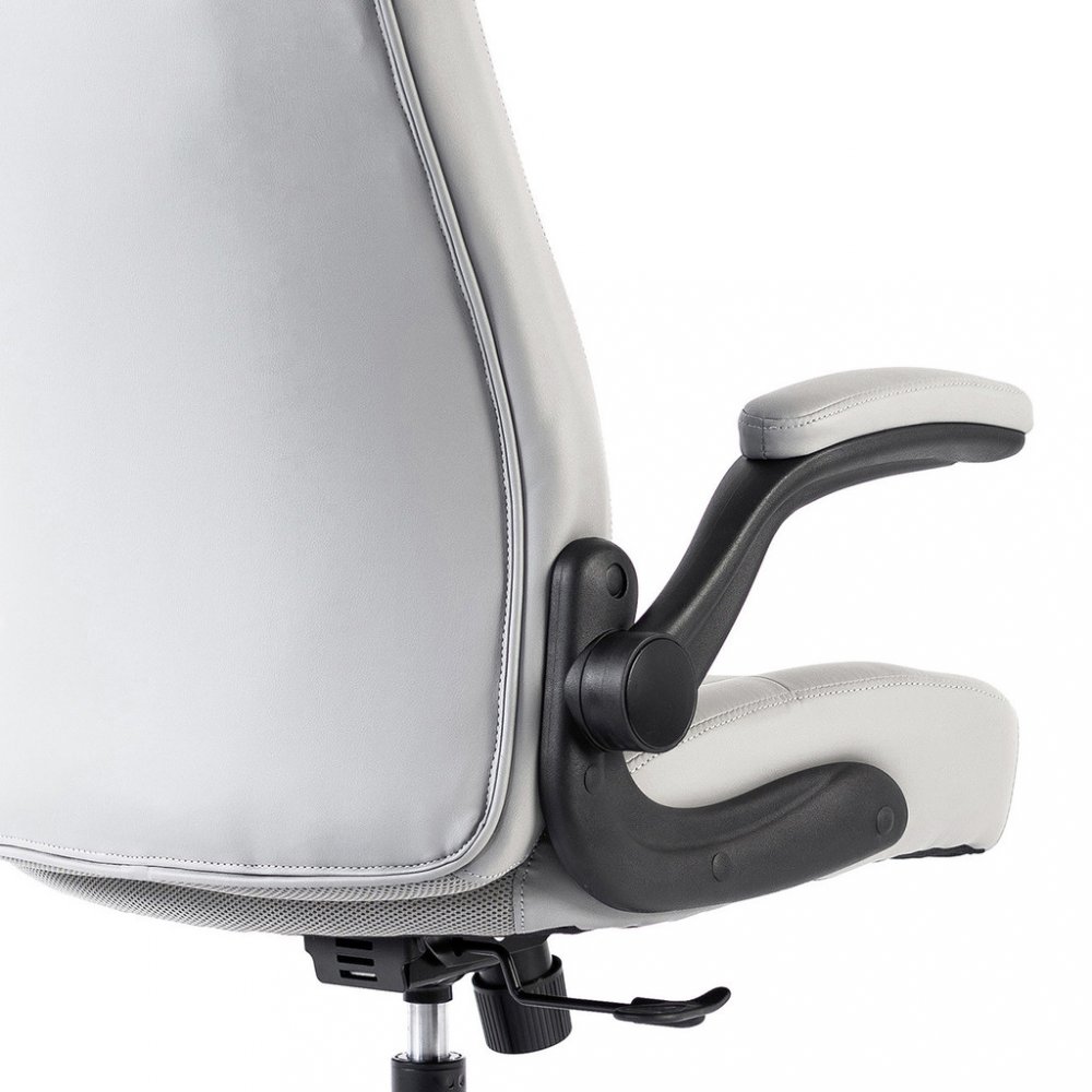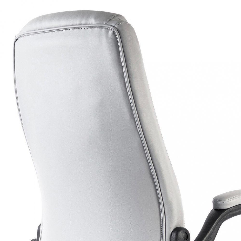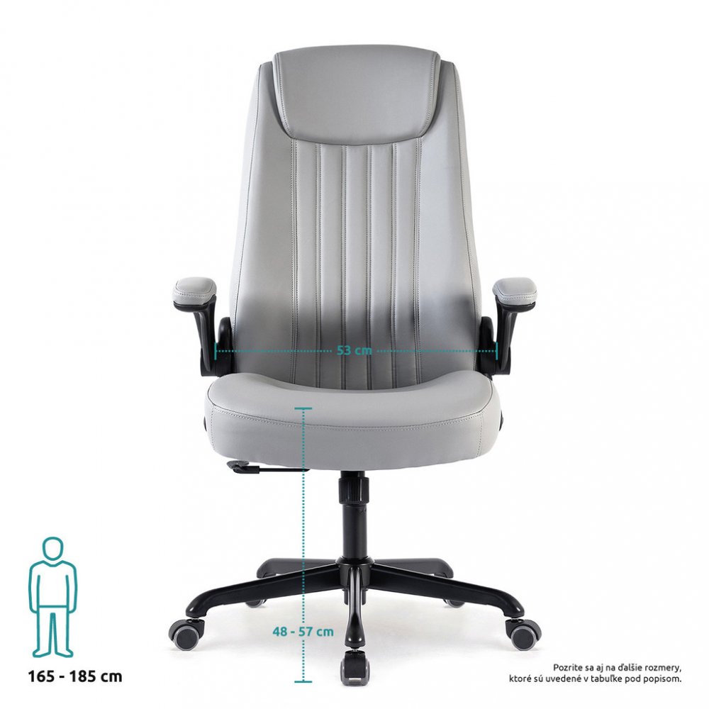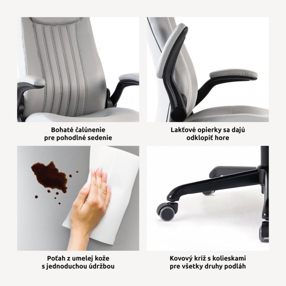 Kancelářské křeslo BOSTON s područkami je moderní křeslo s výjimečným polstrováním. Jeho hlavní předností je široký a pohodlný sedák. Ergonomicky tvarovaný opěrák je ideální pro správné držení těla bez nepříjemných bolestí zad. Je doplněný o zvýšenou opěrku hlavy. Křeslo vám poskytne pohodlné sezení na dlouhé hodiny. Své místo najde v každém interiéru, nebo kanceláři firmy. Potah křesla je z jemné a odolné umělé kůže světle šedé barvy se snadnou údržbou. Elegantní prošití vypadá fantasticky! Ruce si můžete položit na čalouněné područky, které se dají odklopit směrem nahoru. Svojí velikostí je vhodné pro osoby s výškou do 185 cm. Křeslo má kvalitní houpací mechaniku s nastavením síly houpání. Ta umožňuje změnit sklon křesla s aretací v několika polohách nebo si zvolit relaxační polohu (houpání). Síla houpání se reguluje v závislosti na váze uživatele velkým plastovým šroubem umístěným pod sedákem. Výška sezení se upravuje plynule páčkou. Je použitý kvalitní plynový píst s certifikátem BIFMA Class 3, černý kovový kříž má kolečka o průměru 50 mm pro všechny druhy podlah. Kancelářské křeslo má nosnost max. 130 kg, záruka 24 měsíců.