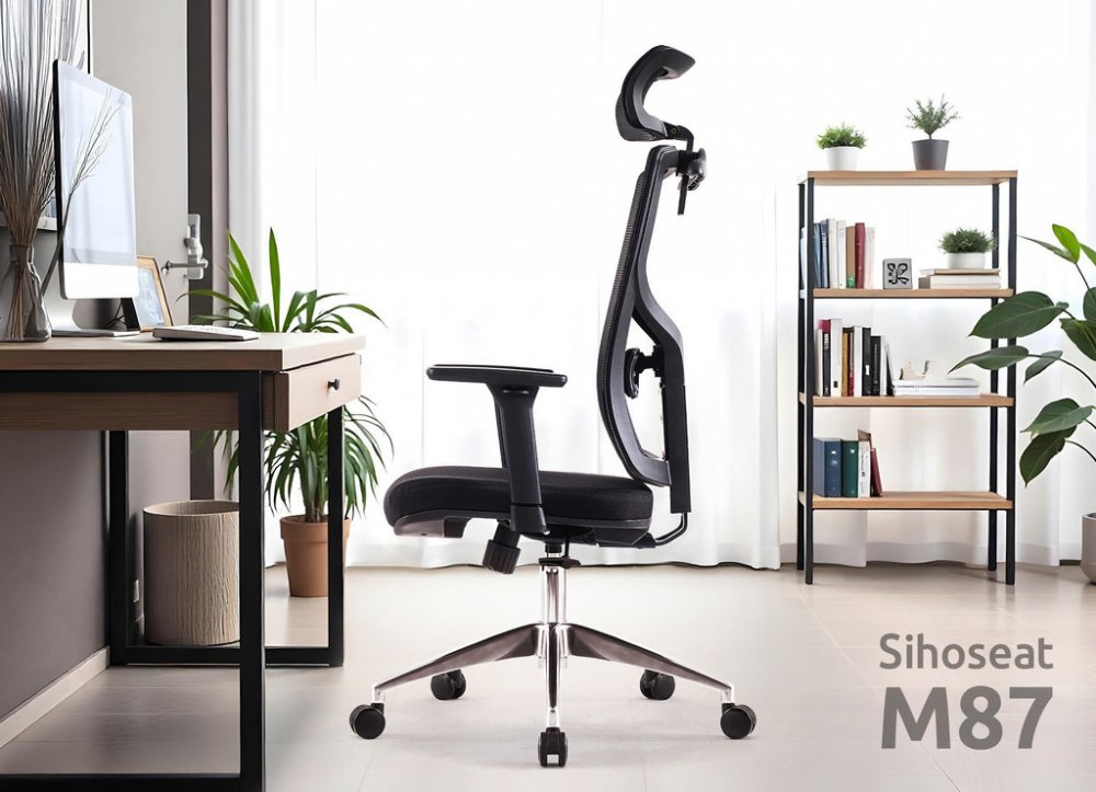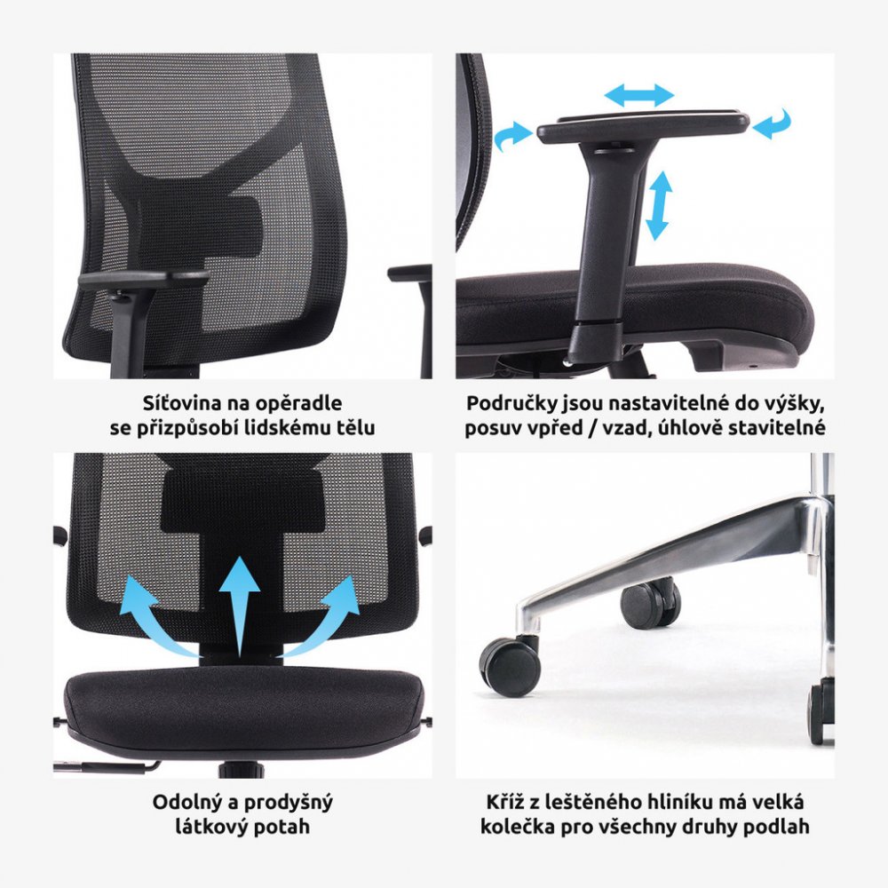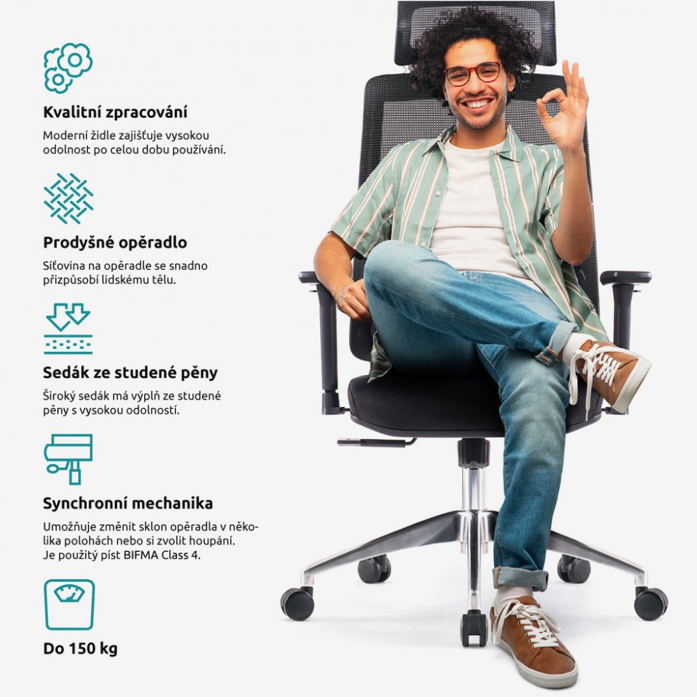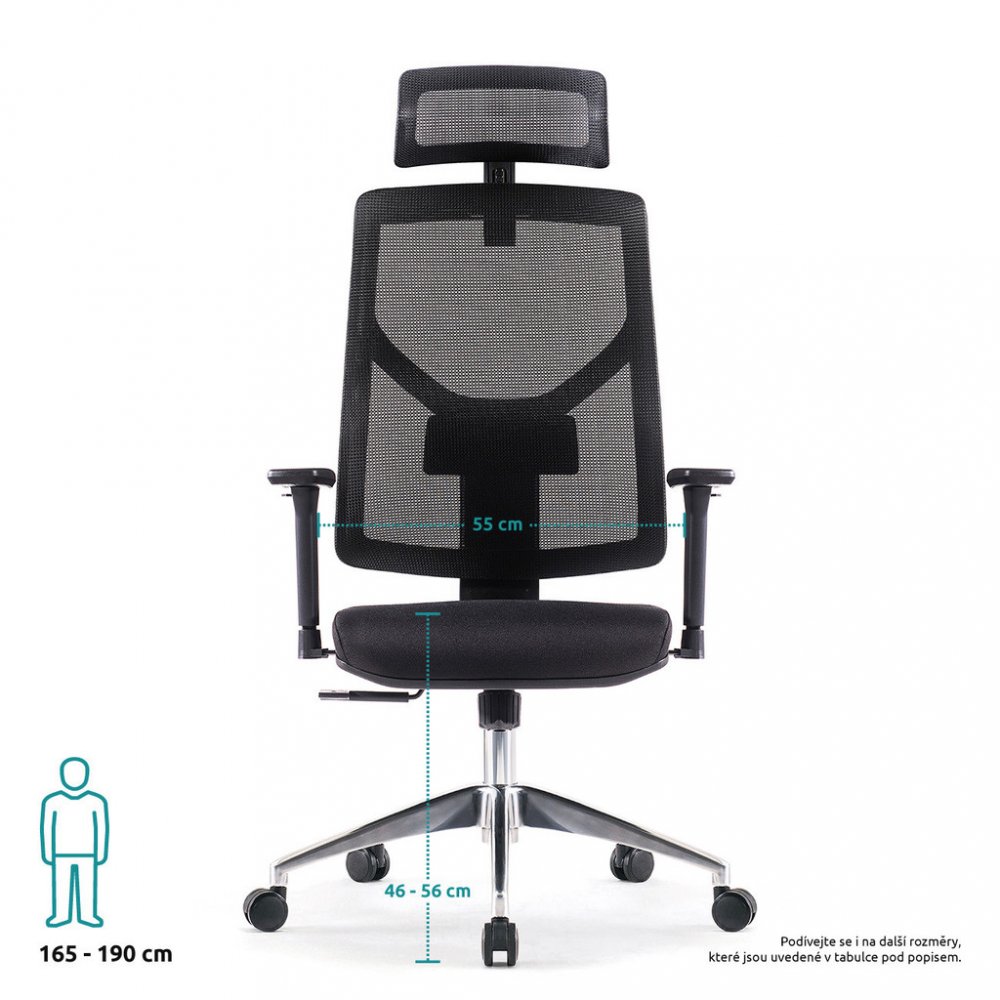 Kancelářská židle SIHOSEAT M87B s područkami a podhlavníkem je určena všem, kteří potřebují kvalitní židli pro práci nejen u počítače. Nová řada „M“ od Superkancl nabízí komfortní sedák s anatomickým polstrováním, který vám poskytne pohodlné sezení na dlouhé hodiny. Pro výplň je použita studená pěna s vysokou odolností proti prosezení. Je potažený kvalitní látkou Bondai s odolností 150 000 cyklů. Síťované opěradlo zad je výškově stavitelné systémem up-down v několika polohách. Je doplněné o hloubkově nastavitelnou bederní opěrku a zakončené síťovaným 3D podhlavníkem, ten je výškově nastavitelný s naklápěním. Ramínko na šaty má nosnost 3 kg. Svojí velikostí je židle vhodná pro osoby s výškou do 190 cm. Ruce si můžete pohodlně položit na výškově stavitelné 3D područky s měkkou dotykovou plochou s možností posunutí vpřed, vzad a pootočení – úhlové nastavení s kovovou konstrukcí. Je použita kvalitní synchronní mechanika s nastavením síly protiváhy pro dynamické a zdravé sezení. Dále umožňuje změnit sklon opěradla s aretací v několika polohách nebo si zvolit relaxační polohu (houpání). Síla houpání se reguluje v závislosti na váze uživatele velkým plastovým šroubem umístěným pod sedákem. Je použitý kvalitní chromový píst s certifikátem BIFMA Class 4, luxusní kříž z leštěného hliníku má velká pogumovaná kolečka o průměru 65 mm pro všechny typy podlah. To vše je v ceně! Kvalitní síťovaná židle je ideální do kanceláří, ordinací i domácich pracoven. Kancelářská židle má nosnost max. 150 kg, záruka 36 měsíců.
