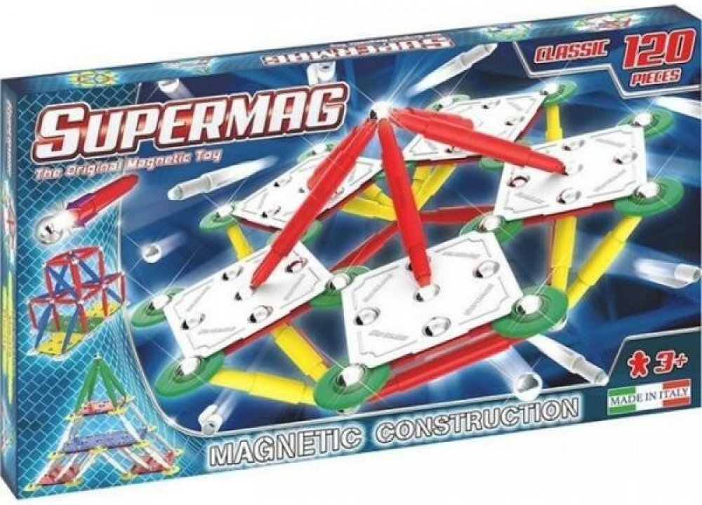 Supermag Classic Primary 120 je velká sada, která poskytuje dostatek barevných tyčinek, ocelových kuliček a plastových komponentů (základny a kroužky) na neomezené tvoření masivních a stabilních trojrozměrných struktur. Tato sada pomáhá dětem učit se hrou o magnetismu a statice, a zároveň rozvíjí jejich představivost a manuální dovednosti díky velkému objemu dílů, které jsou všechny v základních (...