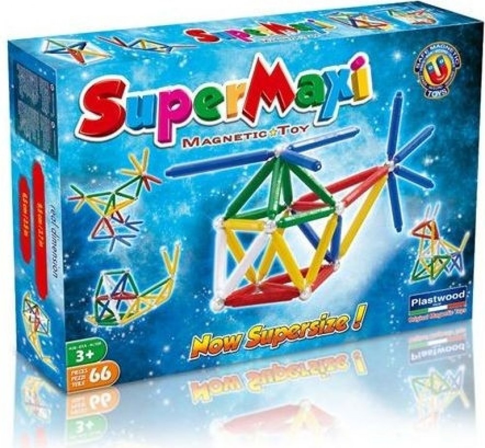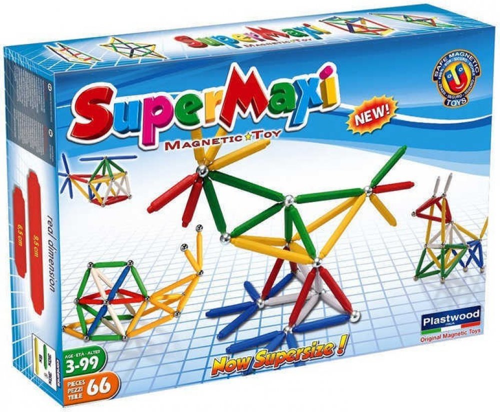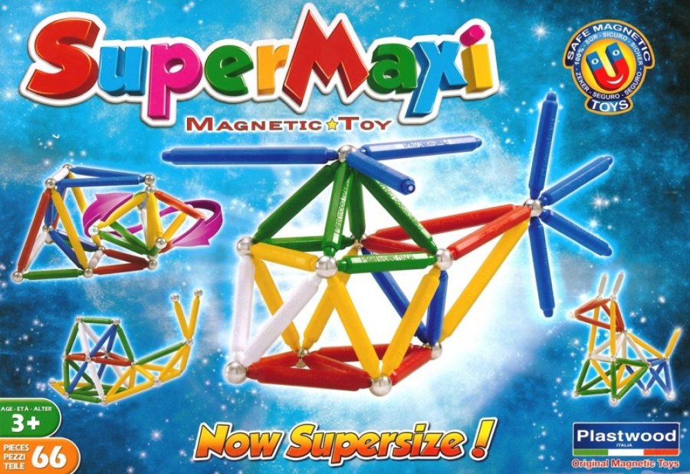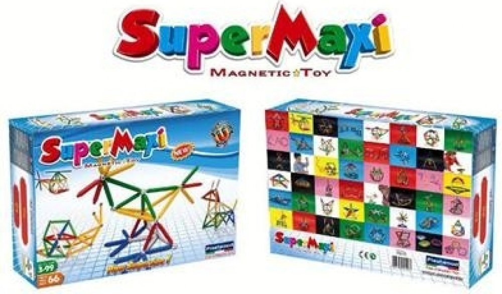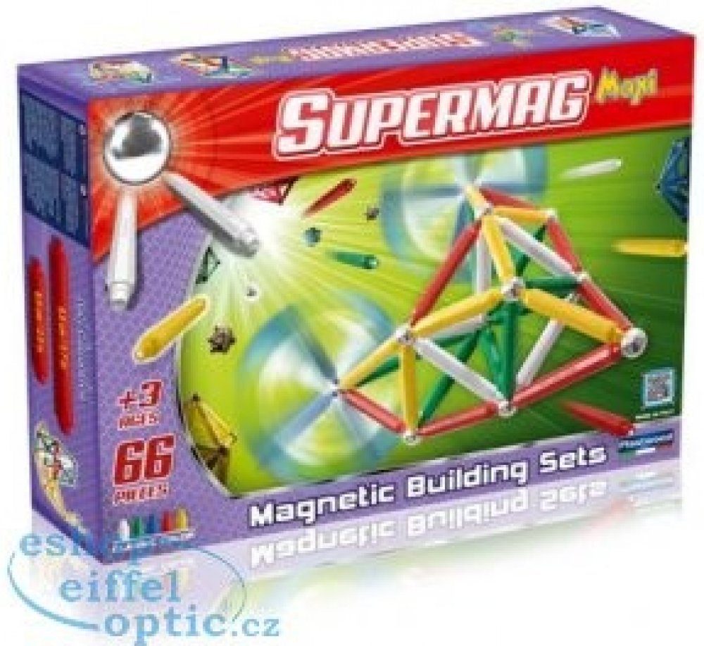 Stavebnice Supermag MAXI - 66 dílků. Balení obsahuje krátké a dlouhé magnetické tyčinky a kuličky. Tyčinky jsou vyráběny v pěti základních barvách (červená, modrá, žlutá, bílá a zelená), v jednom balení jsou vždy tyčinky pouze ve dvou uvedených barvách. Stavebnice je určena pro děti od 3 let.