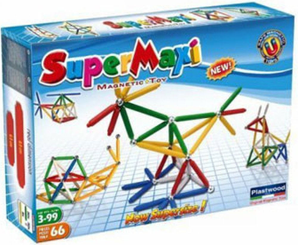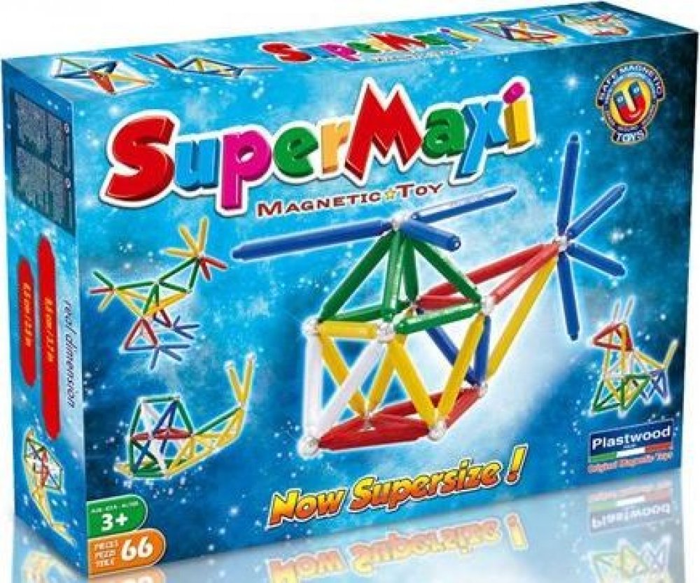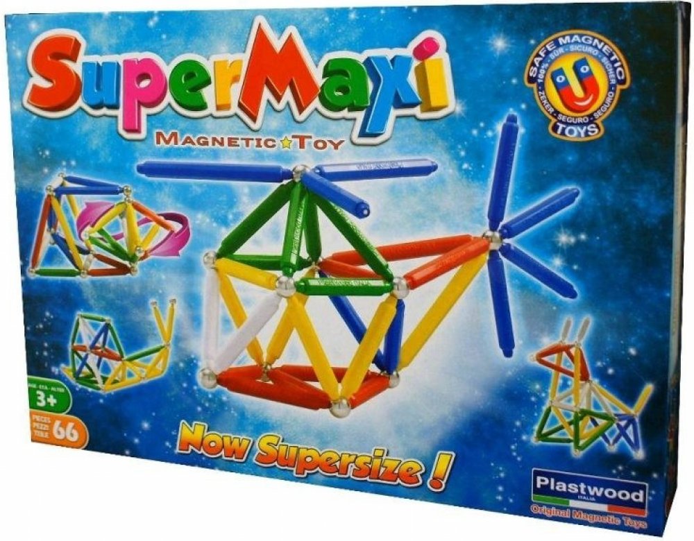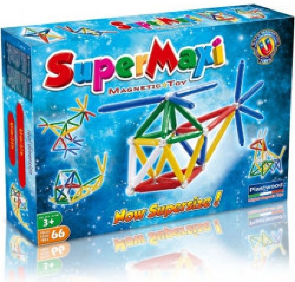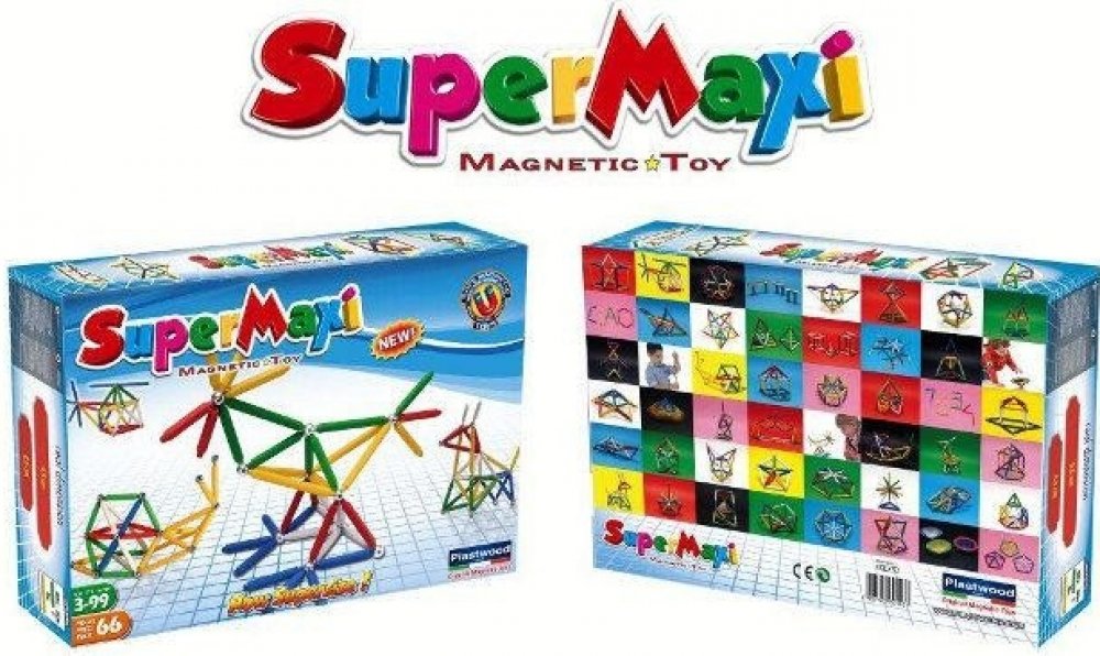 Stavebnice Supermag MAXI - 66 dílků. Balení obsahuje krátké a dlouhé magnetické tyčinky a kuličky. Tyčinky jsou vyráběny v pěti základních barvách (červená, modrá, žlutá, bílá a zelená), v jednom balení jsou vždy tyčinky pouze ve dvou uvedených barvách. Stavebnice je určena pro děti od 3 let.