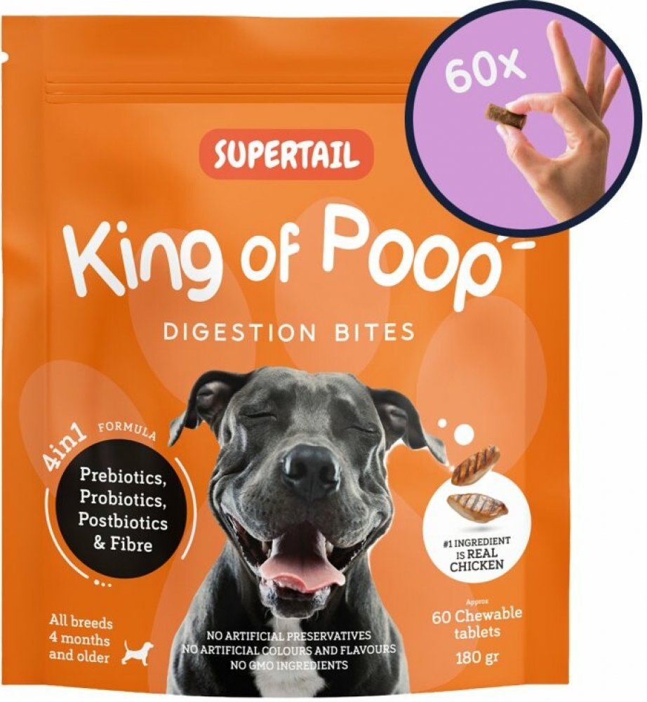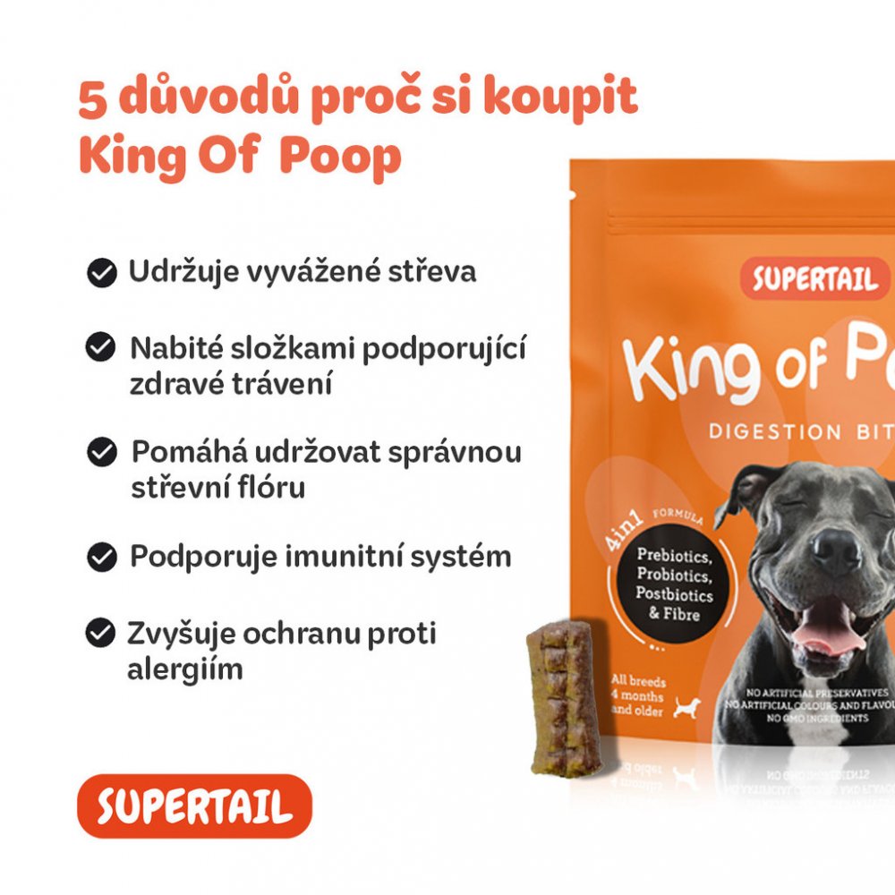 Je-li vaším cílem, aby měl váš pes potřebnou kondici, je třeba myslet na jeho výživu. Největší důraz je kladen na pestrou stravu obsahující vitamíny a minerály, k níž ještě můžete přidat kvalitní doplněk stravy pro psy Supertail. Nabízený výrobek se chlubí mnoha výhodami. Dodává tělu prospěšné bakterie, které mají pozitivní účinky na správné fungování trávicího traktu, a tak zklidňují zažívání a pomáhají od průjmu, zácpy či nadýmání. Aby účinky tohoto přípravku byly správné, je třeba věnovat pozornost stáří zvířete a doporučovanému dávkování, kterým je tento přípravek určený. Tento přípravek může užívat pejsek jakéhokoliv věku. Doplněk stravy pro psy Supertail se vyrábí ve formě lahodných pamlsků a váš pes si na nich pochutná. Balení má celkovou hmotnost 210 g. Klíčové parametry doplňku stravy pro psy SUPERTAIL King Of Poop - doplněk stravy pro podporu střevní flóry a imunity, 60 ks Řadí se k ideálním doplňkům pestré stravy V jeho složení jsou obsaženy trávicí bakterie Doplněk stravy Supertail je určen...