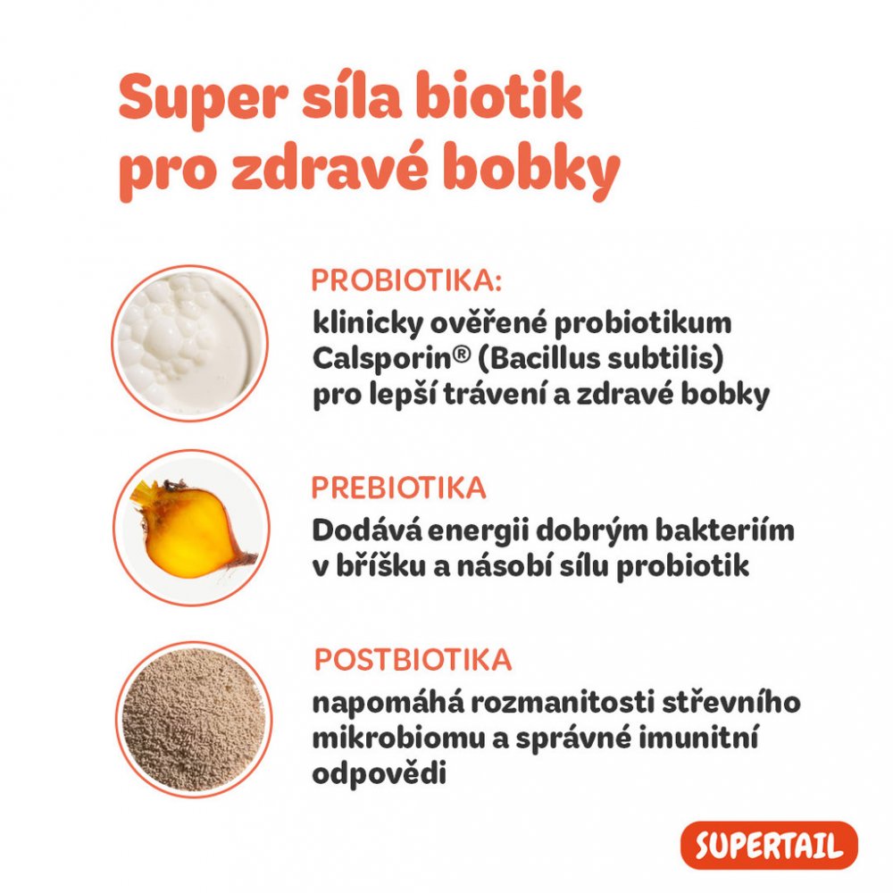 Je-li vaším cílem, aby měl váš pes potřebnou kondici, je třeba myslet na jeho výživu. Největší důraz je kladen na pestrou stravu obsahující vitamíny a minerály, k níž ještě můžete přidat kvalitní doplněk stravy pro psy Supertail. Nabízený výrobek se chlubí mnoha výhodami. Dodává tělu prospěšné bakterie, které mají pozitivní účinky na správné fungování trávicího traktu, a tak zklidňují zažívání a p...