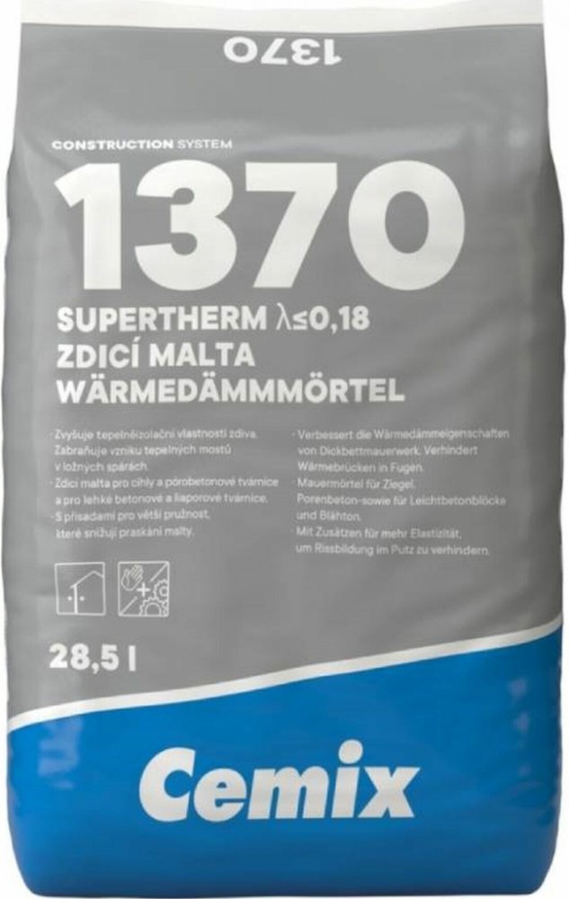 Malta snižující riziko tepelných mostů.Cementová tepelněizolační zdicí malta: Zlepšuje tepelně izolační vlastnosti zdiva (λ ≤ 0,18 W/m.K).Použití:Pro všechny cihly, pórobetonové tvárnice a tvárnice z lehkého betonu.Vlastnosti:Zabraňuje vzniku tepelných mostů ve spárách.S přísadami pro větší pružnost, které zabraňují praskání omítky.Technické paraletry:Pevnost v tlaku: 5 MPaZrnitost: 2 mm Vydatnost cca: 0,65 kg/dm³Doporučená tl.: 12 mmSpotřeba při doporučené tl. cca: 15,5 kg/m²