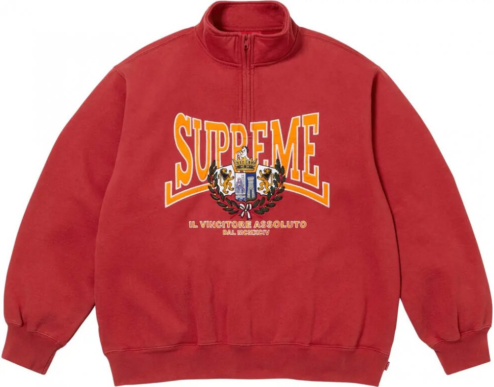 Půlmikina na zip Supreme Crest Applique Half Zip Pullover v červené barvě. Tato mikina se vyznačuje moderním a stylovým designem. Je vyrobena z prvotřídní bavlny a má volnější střih. Na přední straně je výrazný grafický motiv s erbem, který je charakteristický pro tuto značku. Je ideální volbou pro každodenní nošení v chladnějším počasí.