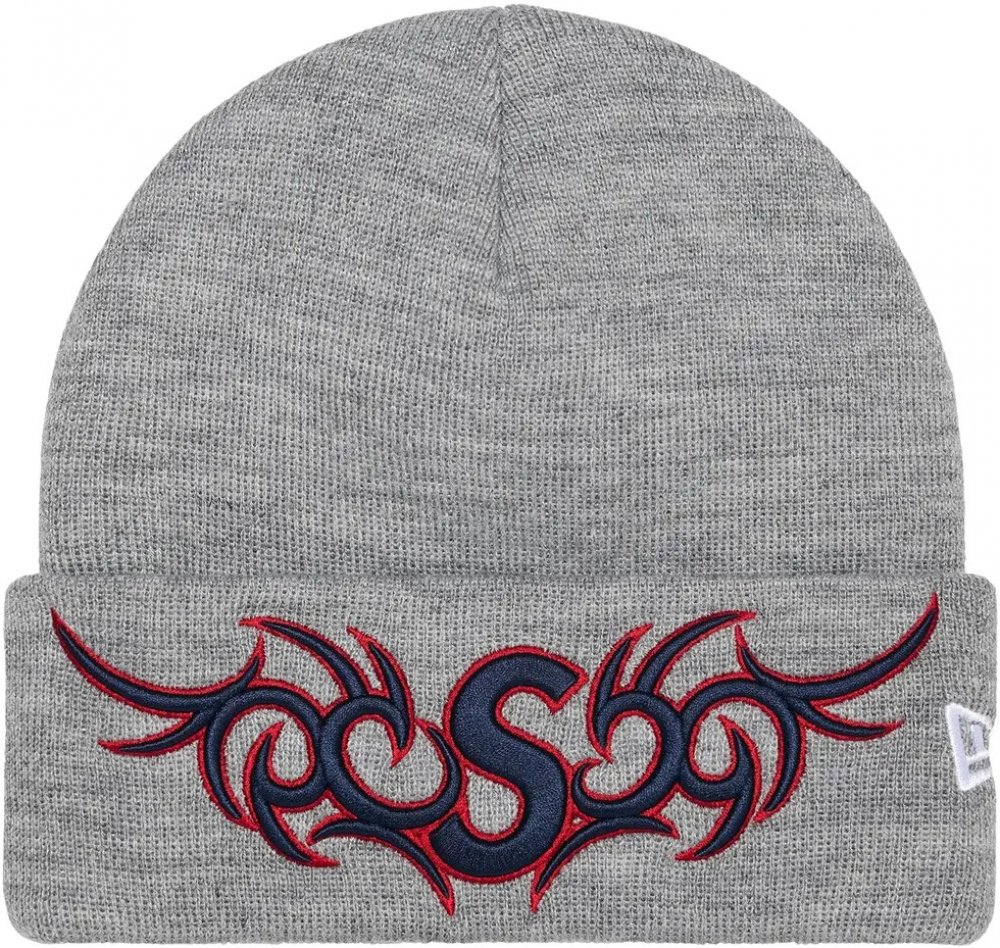 Supreme New Era Tribal S Logo Beanie Heather Grey spojuje klasický šedý úplet s výrazným vyšívaným tribal S logem. Hřejivý a pohodlný materiál doplňuje čistý streetwear styl, typický pro spolupráci Supreme x New Era.