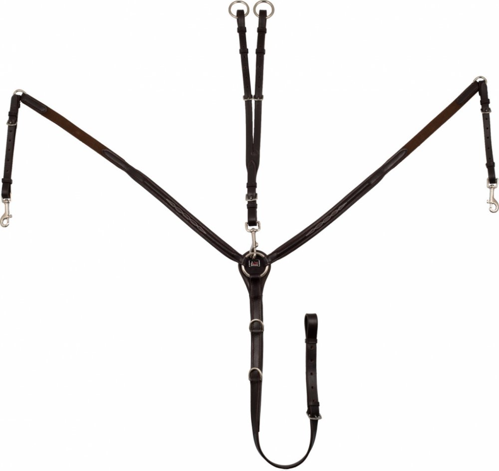 Kvalitní tříbodový poprsník vyrobený z telecí kůže. Vybavený odnímatelnou martingalovou vidlicí. Drží sedlo ve správné poloze a brání posunutí do bederní oblasti. Opatřený kováním z nerezové oceli. Elastická zakončení poskytují maximální pohodlí. Zdobený kontrastním prošíváním. K dispozici také v černé barvě. Dostupný ve velikostech Pony, Cob a Full.