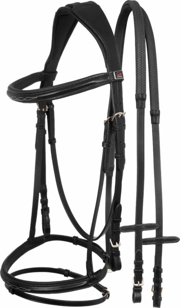 Anglická uzdečka Contrast vyrobená z měkké kůže s nerezovými přezkami, které zaručují mimořádnou odolnost po celou dobu používání. Čelenka je anatomicky tvarovaná pro lepší přizpůsobení, takže tlak vyvíjený na nejcitlivější oblast zátylku je rozložen na větší plochu. Polstrovaná čelenka pro větší pohodlí a zdobené kontrastním prošíváním. Kompletní s otěžemi.