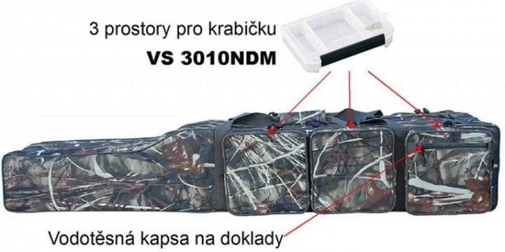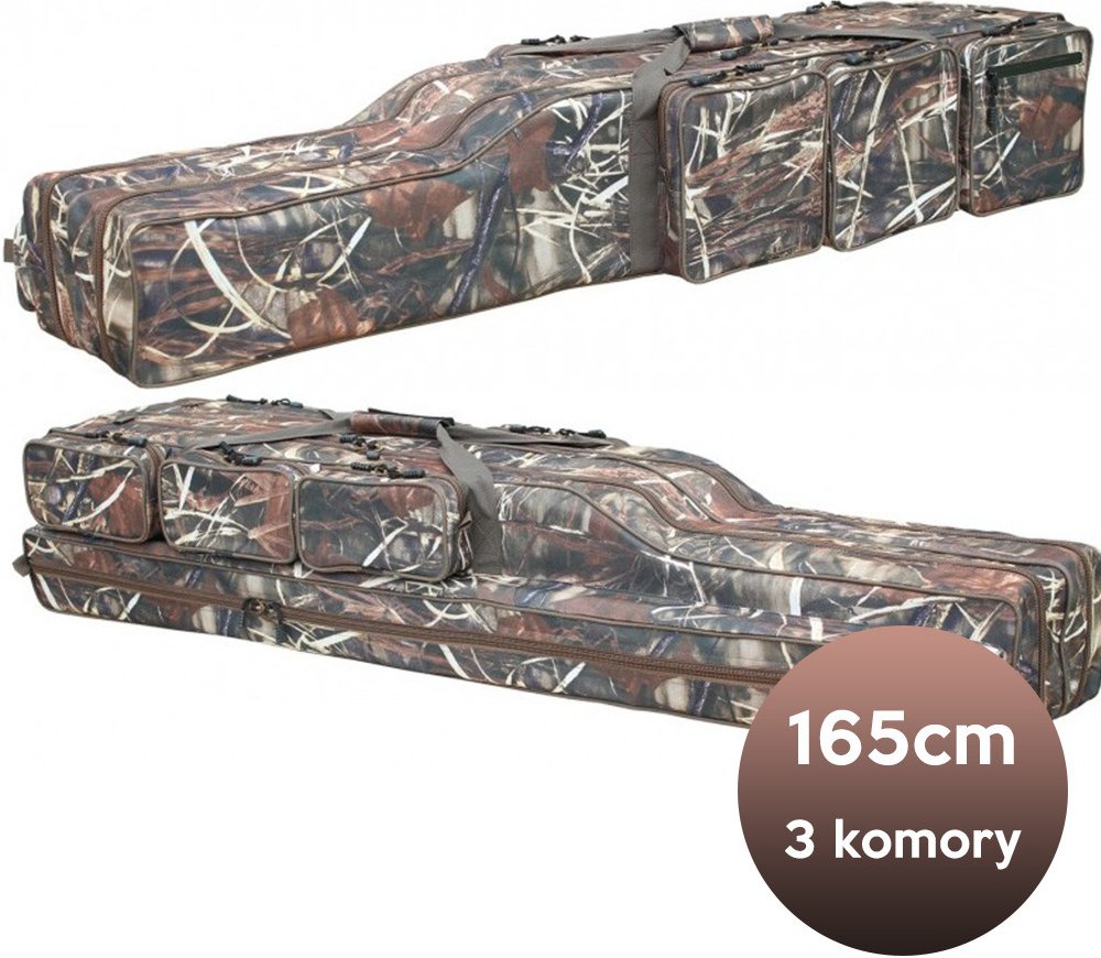 Potřebujete-li uskladnit nebo přenést tři pruty i s navijáky najednou a k nim nejpotřebnější příslušenství, věnujte pozornost prostornému obalu značky Suretti. Disponuje třemi komorami a množstvím kapes pro téměř všechno potřebné vybavení. Je velmi prostorný a směrem ke špici se prakticky zužuje. To nabízí jednak potřebný objem a také bezpečnou fixaci pro špičky prutů. Na jedné straně navíc najdete dlouhou kapsu, do které se vejde i podběrák. Dlouhou životnost zajišťují také silné dvojité zipy opatřené provázky s plastovým gripem. Obal je dále vybaven jednou zcela nepromokavou kapsou pro uložení dokladů, 4 oky na popruzích pro zavěšení různých potřeb a celý je zpracován v elegantní vojenském camo designu.