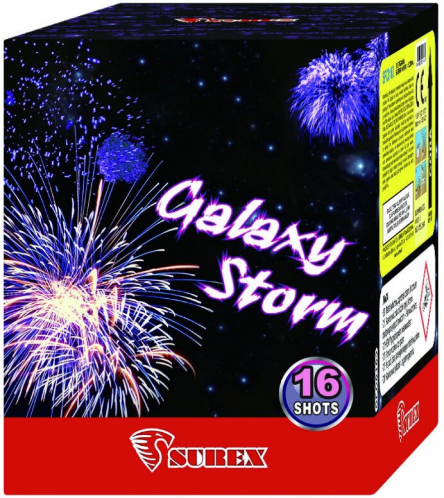 Kompakt GALAXY STORM s 16 ranami přináší úchvatné pyrotechnické představení plné světelných kontrastů a efektního třpytu. Během 23 sekund vystřeluje efekty kolmo vzhůru do výšky až 30 metrů. Můžete se těšit na zlatou třpytivou vrbu s modrou hvězdou, stříbrnou palmu s červenou hvězdou, zlatou praskající palmu s modrým středem a finální stříbrné ocasy přecházející do stříbrných třpytivých vrb. GALAX...