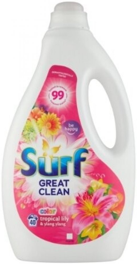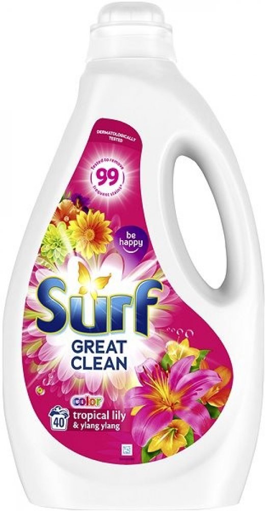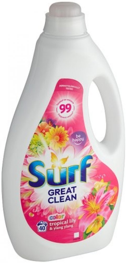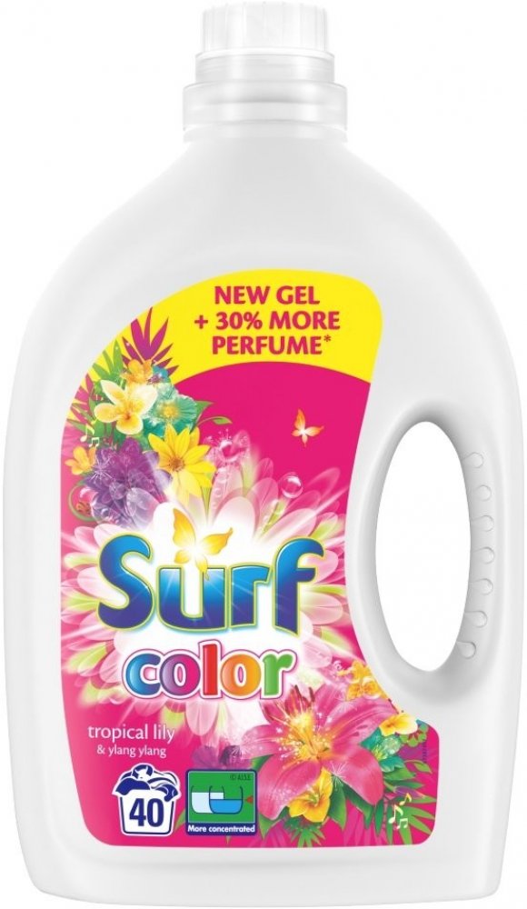Prací gel Surf Color Tropical Lily & Ylang Ylang je bohatou kompozicí dvou exotických květů s překvapující vůní. Ženská, ale silná lilie má lehce medovou, květovou vůni způsobující, že je to jeden z pěti nejžádanějších řezaných květů na světě. Květ ylang ylang má sladké aroma, které je svůdné a utišující. Prý jeho smyslná vůně dokáže spojovat mysl a tělo a uvádět do stavu euforie. Exotická kompozice Surf Tropical Lily & Ylang Ylang je dostupná v podobě tekutého pracího prostředku, pracího prášku i gelových kapslí. Doporučujeme tuto variantu používat na barevné prádlo. Objem 2,8 l – 40 pracích dávek.