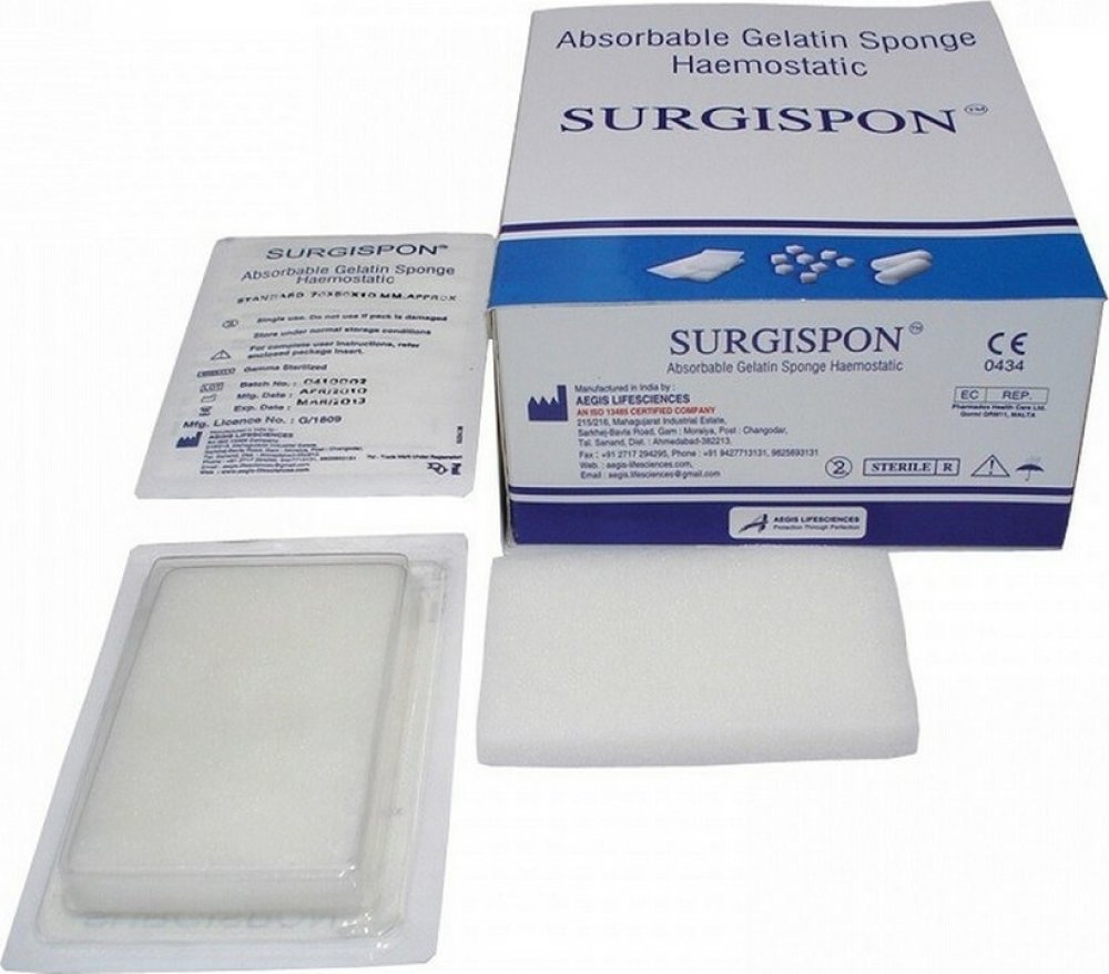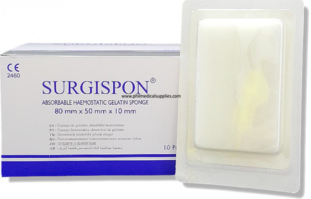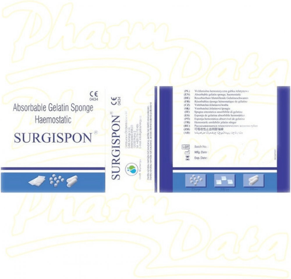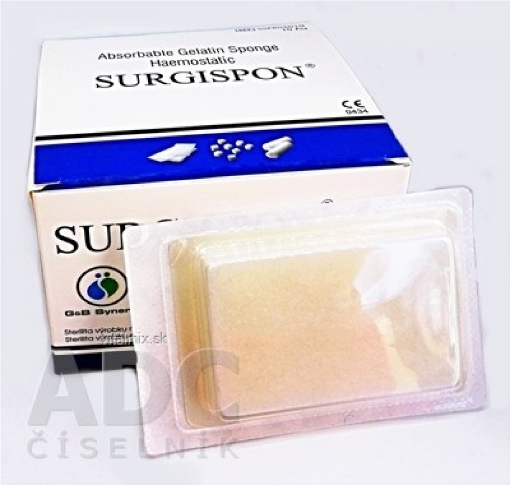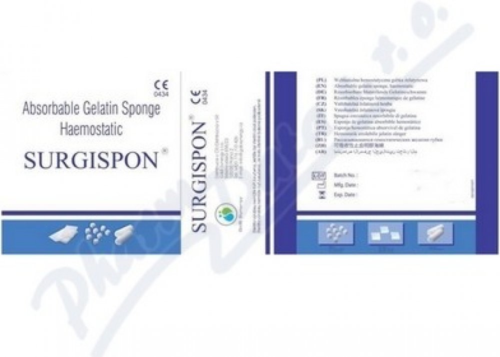 SURGISPON ® je sterilní hemostatická vstřebatelná želatinová houba vyrobená z čisté farmaceutické želatinové (lyofilizovaný hydrolyzovaný kolagen) pěny, která jí dodává jednotnou poréznost a neutrálně reaguje. Vysušená pěna se řeže, balí a sterilizuje pomocí gama záření.
