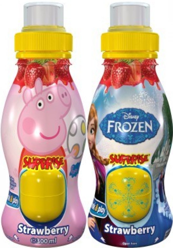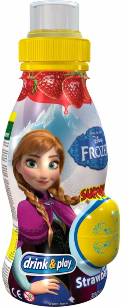 Surprise drinks Jahoda 300 ml. Nesycený ovocný nápoj s jahodovou příchutí a s plastovým vajíčkem s překvapením. Složení: Voda, ovocné šťávy z koncentrátů: jablko 19 %, citron 1 %, regulátor kyselosti: kyselina citronová, sladidla: sukralóza, steviol-glykosidy (extrakt z listů rostliny stévia), aroma, vitamíny: C, B6, B12. Ovocný podíl 20 %.