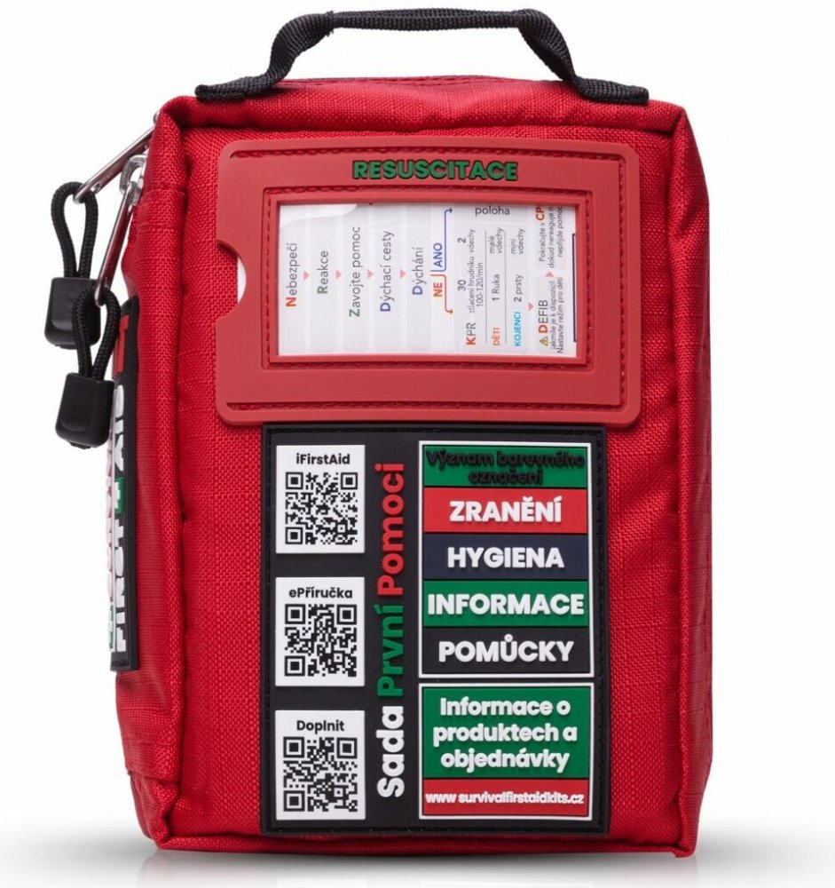 SURVIVAL First Aid KIT – Small je nejkompaktnější lékárnička z celé řady SURVIVAL, navržená pro každodenní nošení i rychlé použití na cestách. Přestože je malá, překvapí svým promyšleným systémem: výbava je rozdělená do barevně označených sekcí podle typu zranění a každá kapsa má jasně čitelný popis, díky kterému okamžitě víte, kam sáhnout.