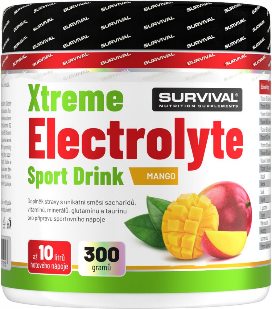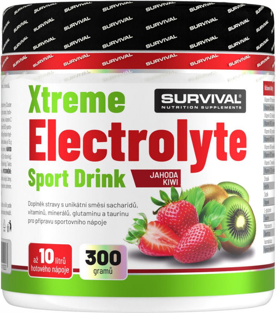 Survival elektrolyty 300 g práškové se středním obsahem sacharidů se středním obsahem sodíku 20 3.0 g per 100 ml 45.0 kcal 0.6 g Na188mg; K249mg; Mg85.2mg; VitC150mg; Glutamin600mg sukralóza 15 g/500 ml (hypoton.); 40 g/750 ml (izoton.)