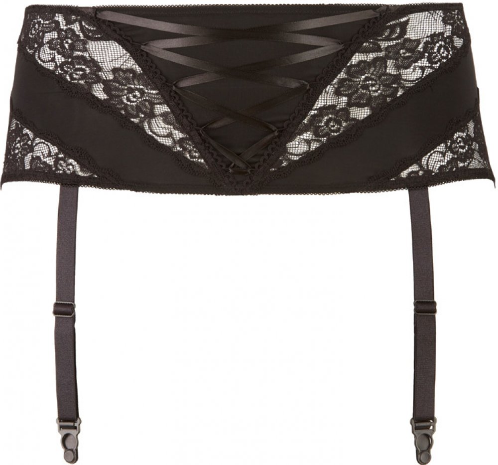 Tento černý podvazkový pás má krajkové vsadky a naznačené šněrování vpředu. Pásek bude hlavní ozdobou každého svůdného outfitu. Čtyři nastavitelné podvazkové pásky drží punčochy na svém místě. Pás má zapínání na háčky vzadu.