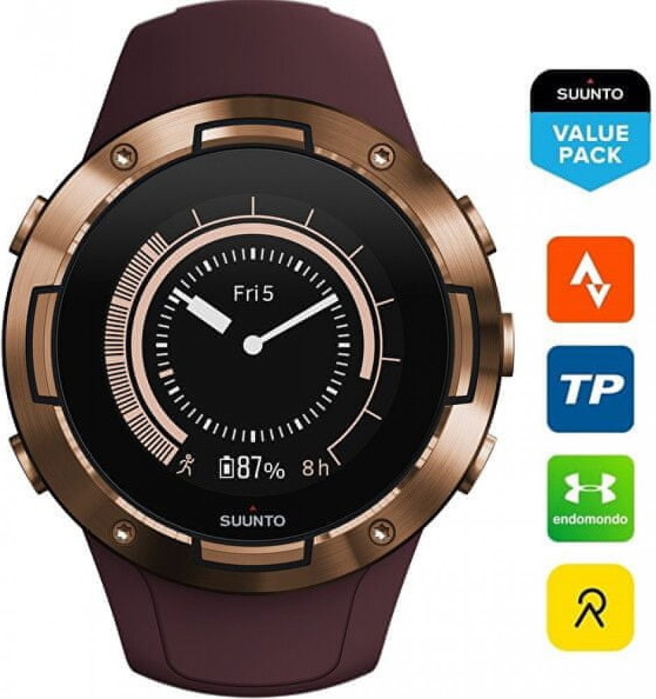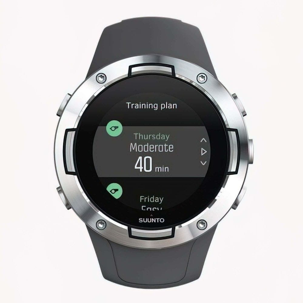 Hodinky Suunto 5 byly vytvořeny ve spolupráci s předními sportovci a konstruovány pro dlouhou výdrž (7 dní při monitorování 24/7). Jsou vybaveny optickým měřením tepu (umožňují také využít i hrudní pás). S mobilní aplikací Suunto App se funkce hodinek rozšiřují – k dispozici máte tréninkový deník, s užitečnými přehledy, sledování cílů a také propojení s aplikacemi Strava, TrainingPeaks, Endomondo a mnoha dalšími.