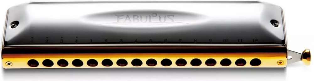 Foukací harmonika Suzuki F-48C, 12 kanálků, chromatická, 48 jazýčků, rozsah tónů c1-d4, přímý mechanismus slideru, velikost: 160x45x33mm, váha: 655g, postříbřený plechový kryt, postříbřený hřeben, ručně dělaný pozlacený náústek, fosforbronzové jazýčky, včetně luxusního polstrovaného koženého pouzdra. Vynikající vzduchová těsnost, okamžitá reakce na každé vydechnutí, bohaté zabravení tónů.