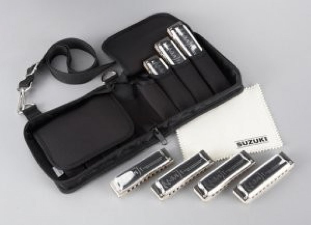 Set sedmi foukacích harmonik Suzuki Manji M-20-7SET v ladění C, G, A, D, E, F a Bb s látkovým pouzdrem na 8 harmonik 10HC-8. Suzuki Manji M-20 jsou harmoniky s výjimečně silným a čistý zvukem a snadným ohýbáním tónů. Nabízejí vynikající kvalitu a provedení. Jsou to diatonické harmoniky a mají 10 kanálků. Jsou vyrobeny s ocelovým krytem a unikátním kompozitovým hř...