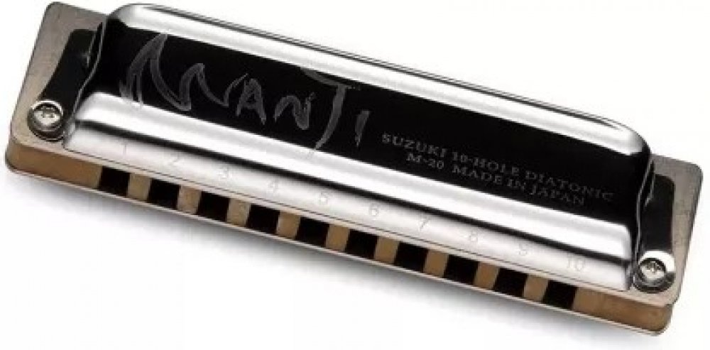 Foukací harmonika Suzuki Manji M-20, Deluxe, 10 kanálků, diatonická, ladění: G, rozměry: 101 x 27 x 18 mm, váha: 65g (109g včetně pouzdra), ocelový kryt, kompozitové tělo simulující vlastnosti dřeva, fosforbronzové jazýčky.