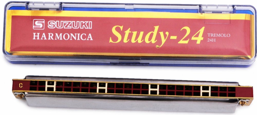 Suzuki Study 24 C je tremolo foukací harmonika určená pro začátečníky a mírně pokročilé hráče. Díky vybraným použitým materiálům, výstupní kontrole kvality a špičkovému procesu ladění se jedná o skvělý nástroj do vašich začátků. Má 24 dvojitých kanálků, 24 tónů a je v ladění C. Je vyrobena s ABS plastovým tělem, ocelovým chromovaným krytem a kvalitními mosaznými jazýčky. Velikost harmoniky je 178 ...