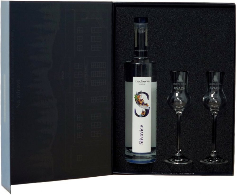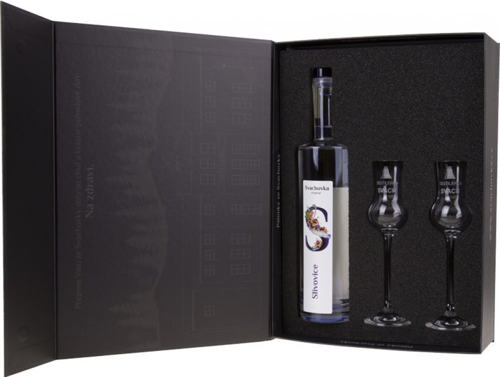 Krásná dárková kazeta s magnetovým uzávěrem obsahuje jednu z nejoblíbenějších svachovských pálenek z toho nejkvalitnějšího ovoce, ručně přebíraného a pomalou destilací vyráběné pod dohledem destilatérů a originální degustační skleničky s logem destilérky Svach.
