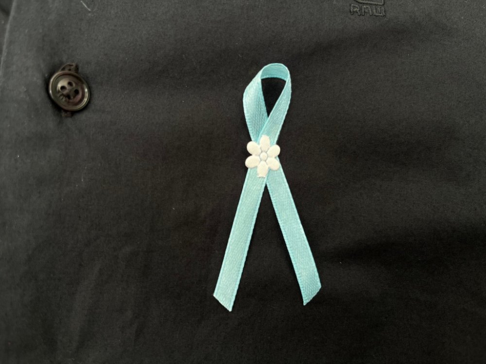 Svatební vývazek ručně vyráběný z 6 mm široké světle modré saténové stuhy zdobený bílou saténovou kytičkou. Vývazek je opatřen špendlíkem pro uchycení.