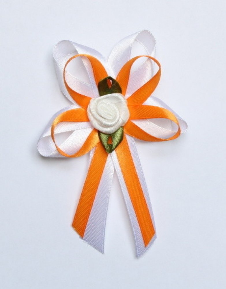 Velký ručně vyráběný svatební vývazek se skládá z 12 mm široké bílé saténové stuhy, 6 mm široké oranžové saténové stuhy a ozdoben je saténovou bílou růžičkou na zeleném saténovým lístku. Vývazek je opatřen spínacím špendlíkem.