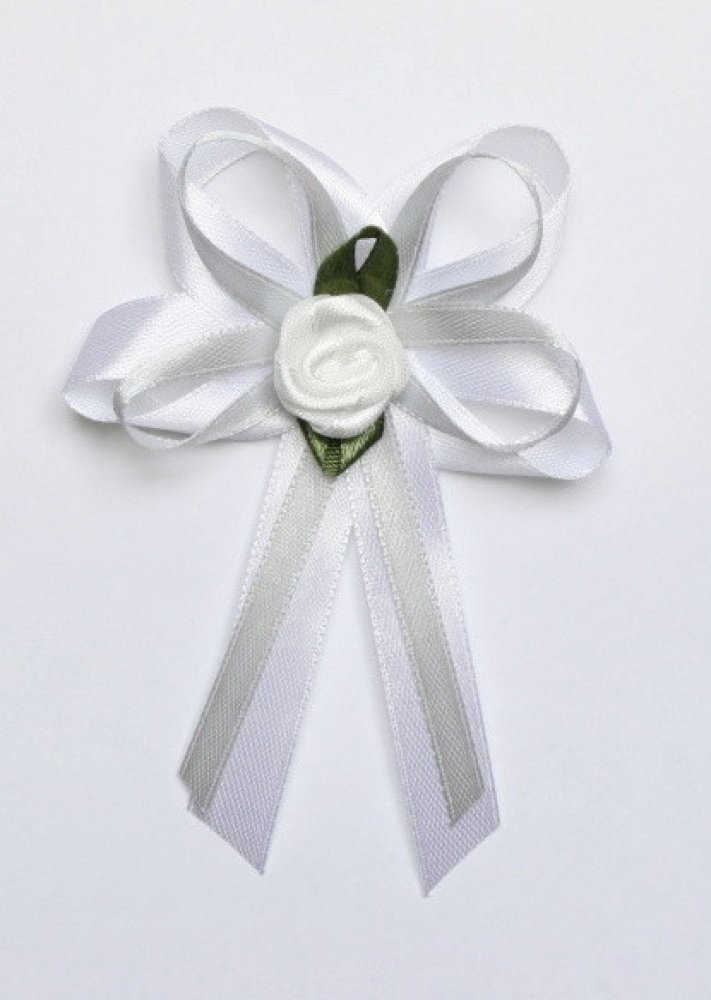 Velký ručně vyráběný svatební vývazek se skládá z 12 mm široké bílé saténové stuhy, 6 mm široké stříbrné saténové stuhy a ozdoben je saténovou bílou růžičkou na zeleném saténovým lístku. Vývazek je opatřen spínacím špendlíkem.