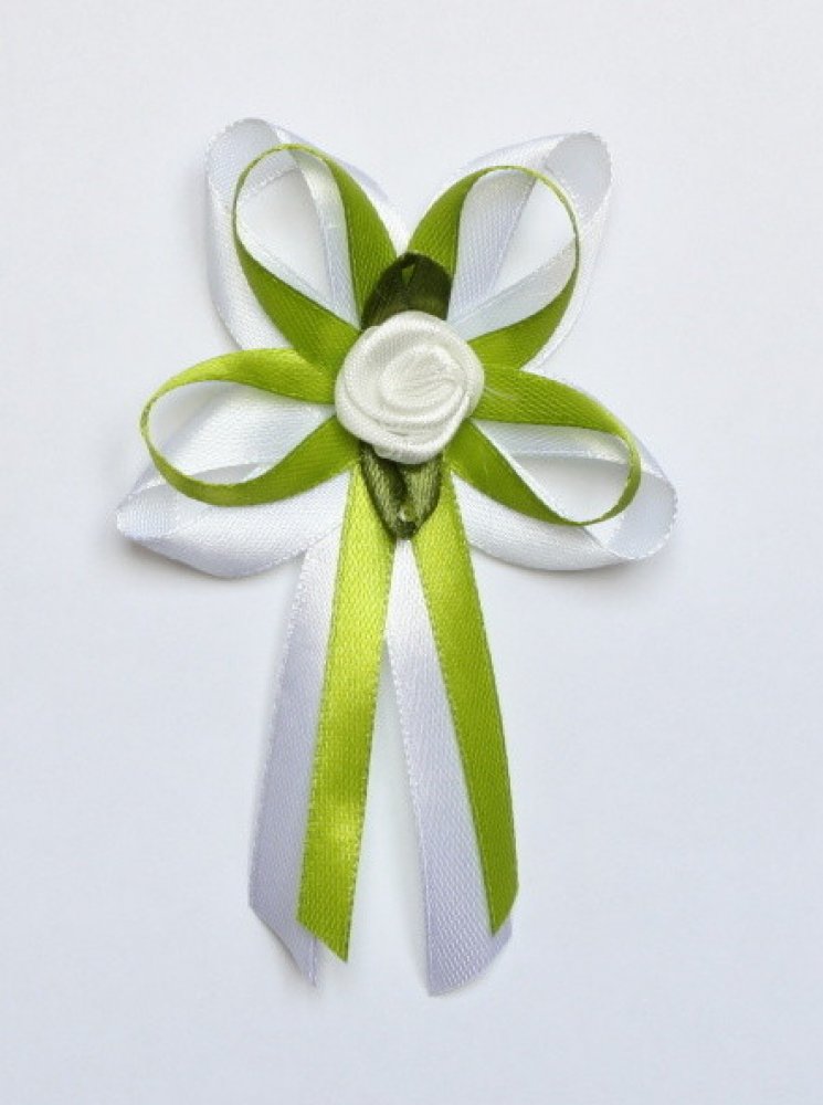 Velký ručně vyráběný svatební vývazek se skládá z 12 mm široké bílé saténové stuhy, 6 mm široké světle zelené saténové stuhy a ozdoben je saténovou bílou růžičkou na zeleném saténovým lístku. Vývazek je opatřen spínacím špendlíkem.