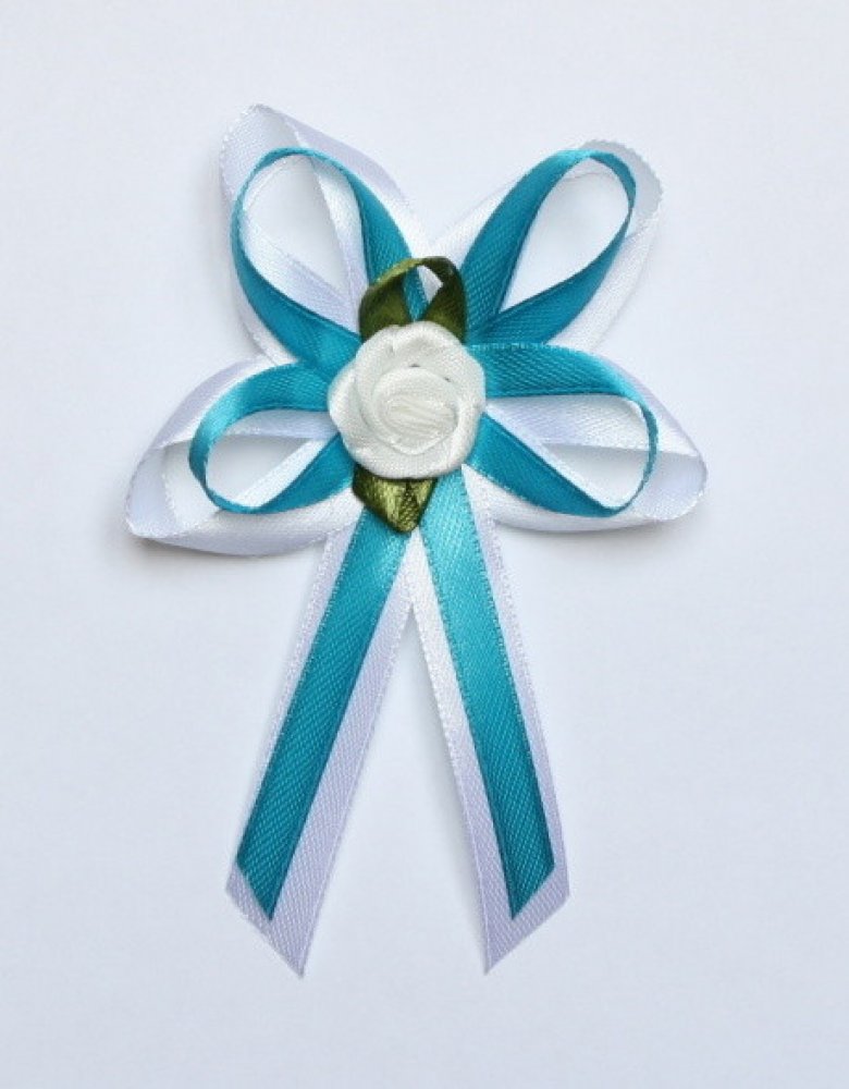 Velký ručně vyráběný svatební vývazek se skládá z 12 mm široké bílé saténové stuhy, 6 mm široké tyrkysové saténové stuhy a ozdoben je saténovou bílou růžičkou na zeleném saténovým lístku. Vývazek je opatřen spínacím špendlíkem.