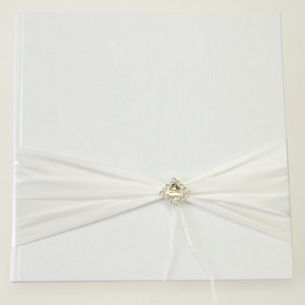 Svatební kniha o velikosti 20 x 20 cm v bílé barvě s bílou širokou atlasovou stuhou a štrasovou ozdobou bude důležitou součástí Vaší svatby.Kniha obsahuje 20 listů ( 40 stran ).Vrchní desky knihy jsou potaženy lesklou mačkanou látkou v bílé barvě. Bílá stuha je připevněna na čelní desce knihy ve vodorovné poloze. Štrasová ozdoba má tvar kosočtverce a skládá se z jednoho velkého a několika malých kamínků. Od štrasové ozdoby vedou další dvě tenké organzové stužky.