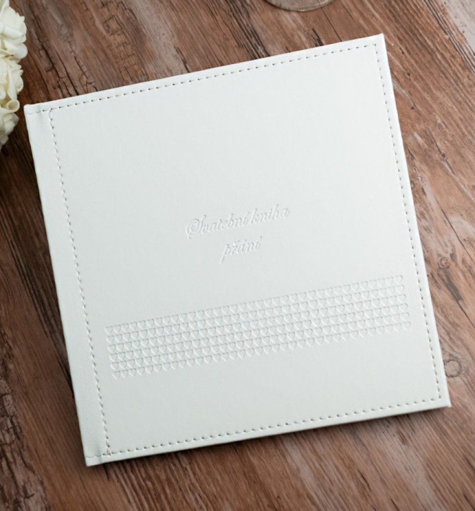 Svatební kniha přání s plastickým motivem, který je aplikován ražbou do exkluzivního potahového materiálu v ivory barvy. Celkový dojem ještě zvýrazňuje šití bílou nití po obvodu knihy.