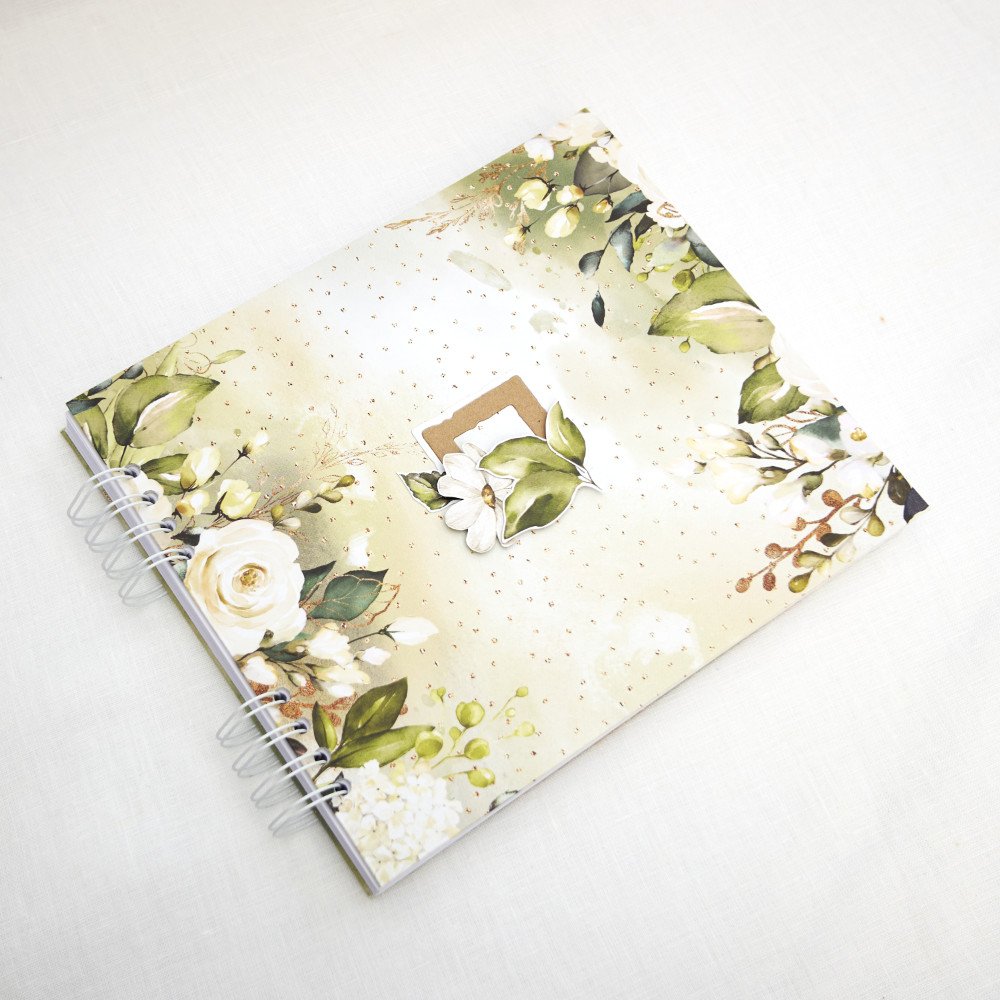Tato svatební kniha má pevné desky z knihařské lepenky ozdobené krásným scrapbookovým papírem, drobnými lístky a kytičkou. Má celkem 40 listů plus dva bonusové, jejichž gramáž je 180 g/m2. Vazba je kroužková. Úvodní stránka má nápis Svatební kniha a poslední stránka nápis Děkujeme Vám. Na přání Vám mohu knihu doplnit o srdce se jmény novomanželů nebo okénko s datumem svatby. Listy knihy jsou dostatečně pevné na vložení fotek s momentkami z nejkrásnějšího dne a je jich tak akorát, aby se sem vešly milé a vtipné vzkazy svatebních hostů. Pokud byste si nevybrali z mé nabídky, velmi ráda vám vyrobím knihu podle vašich představ. Rozměry stránek jsou 24 x 21 cm, rozměry celé knihy včetně kroužkové vazby pak 25,5 x 21 cm.
