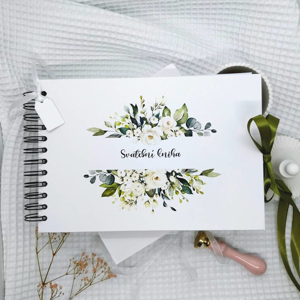 Tato svatební kniha má pevné desky z knihařské lepenky o síle 3 mm, potažené krásným papírem s motivem bílých kvítků a svěží zeleně. Má celkem 30 listů plus dva bonusové, jejichž gramáž je 180 g/m2. Vazba je kroužková. Úvodní stránka má nápis Svatební kniha a poslední stránka nápis Děkujeme Vám. Na přání Vám mohu knihu doplnit o srdce se jmény novomanželů nebo visačku s iniciály a s datumem svatby...