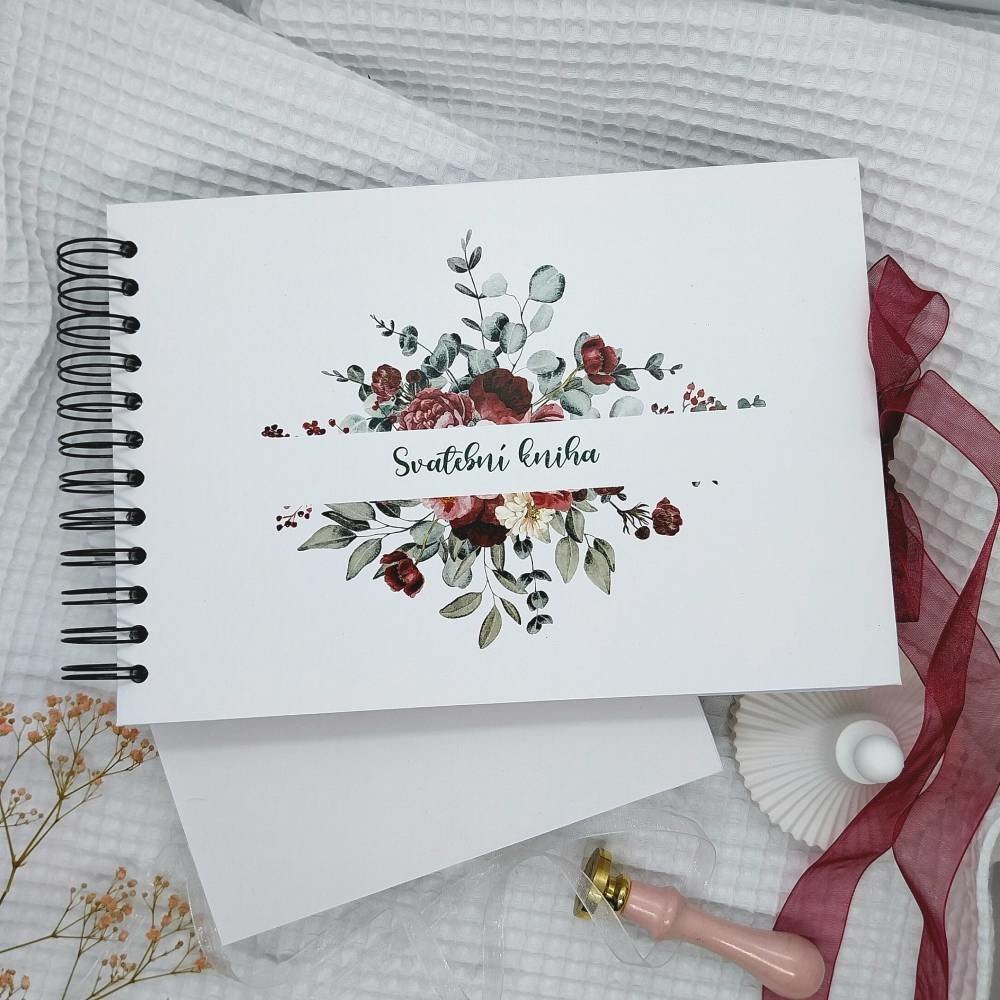 Tato svatební kniha má pevné desky z knihařské lepenky o síle 3 mm, potažené krásným papírem s motivem květin v barvě burgundy. Má celkem 30 listů plus dva bonusové, jejichž gramáž je 180 g/m2. Vazba je kroužková. Úvodní stránka má nápis Svatební kniha a poslední stránka nápis Děkujeme Vám. Na přání Vám mohu knihu doplnit o srdce se jmény novomanželů nebo visačku s iniciály a s datumem svatby. Lis...