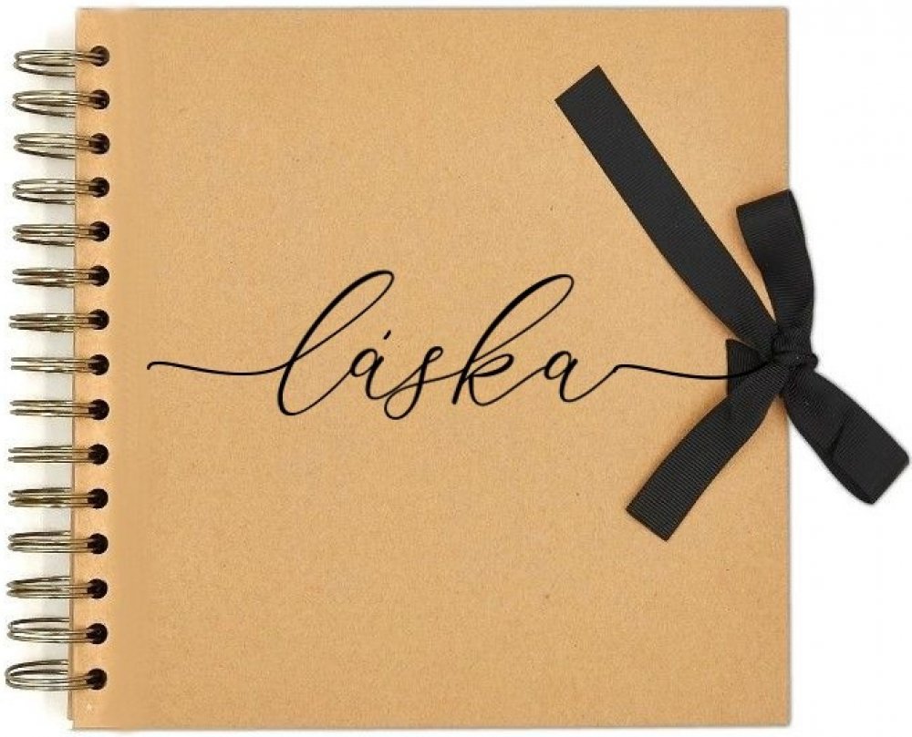 Nápis LÁSKA v černé barvě, zlatá kroužková vazba.