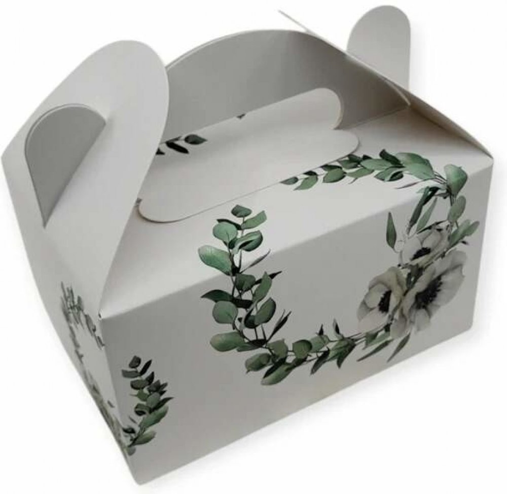 Designová luxusní krabička na zákusky a cukroví vyrobená z hladkého pololesklého papíru. Krabičku dodáváme v rozloženém stavu, je částečně lepená, otevřením krabičky do sebe zapadnou vyseknuté zámky dna, jednoduché zajištění bočních klop zajišťuje pevné uzavření a zvyšuje pevnost krabičky. Krabička je opakovatelně otevíratelná, určená pro přímý styk s potravinami a zdravotně nezávadná.