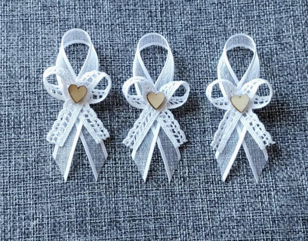 Ozvláštněte i vy svůj den D svatebními, ručně a s láskou vyráběnými, mašličkami laděnými do bílé barvy a ozdobené dřevěným srdíčkem.