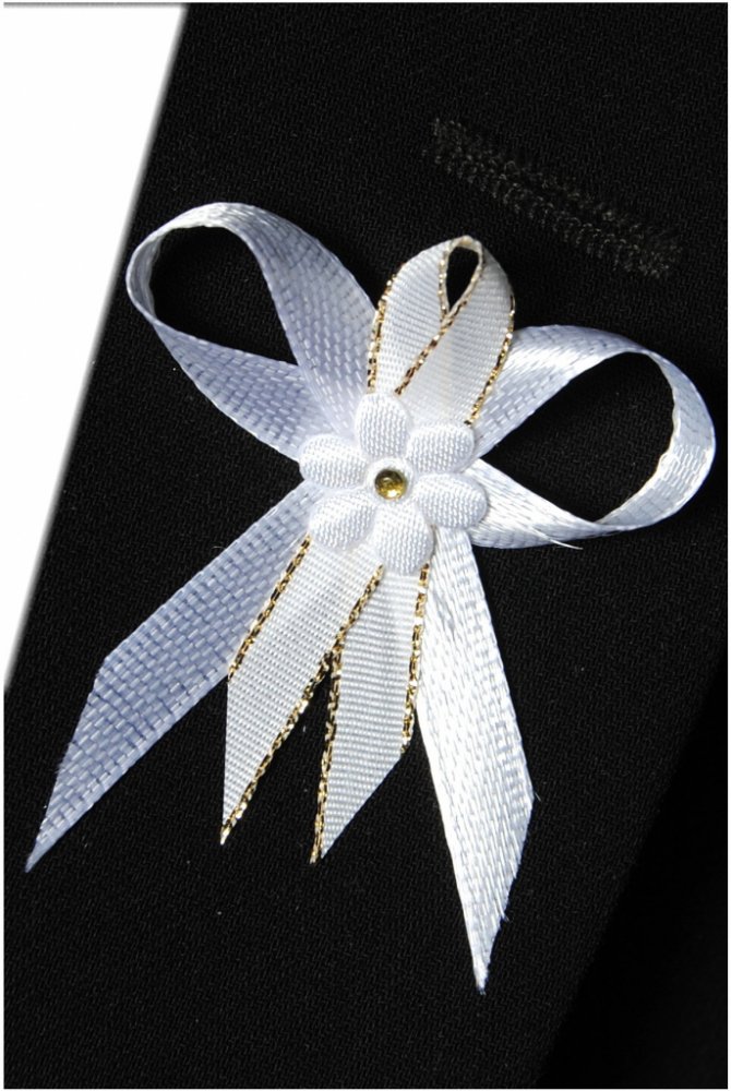 Ozvláštněte i vy svůj den D svatebními, ručně a s láskou vyráběnými, mašličkami laděnými do bílo zlaté barvy a dozdobené bílou květinkou se zlatým kamínkem.