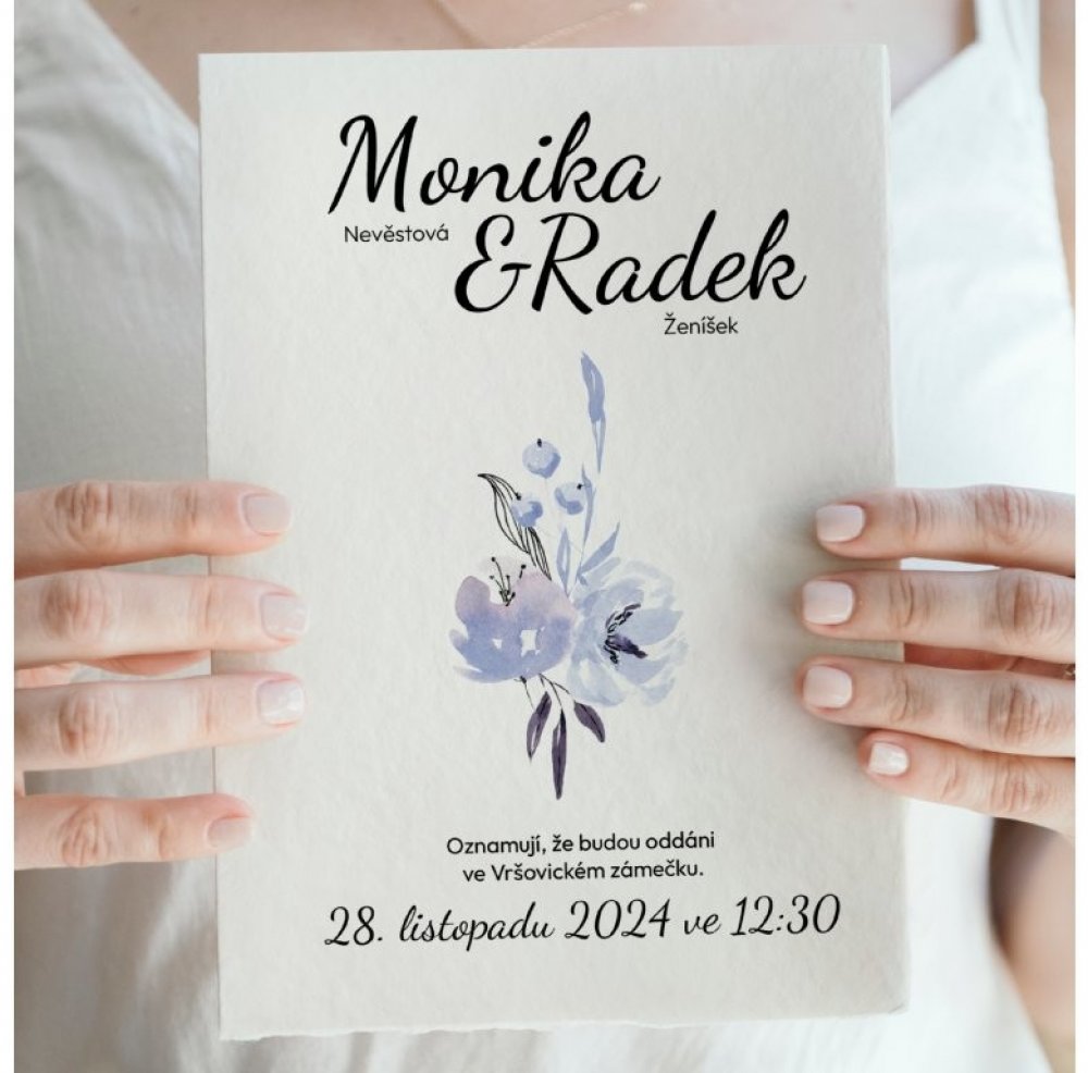 Naše svatební oznámení vám umožní stylově oznámit váš velký den. Tiskneme je na kvalitní papír s gramáží 250 g/m², který zajistí, že vaše oznámení zanechá nezapomenutelný dojem. Vybírat můžete z mnoha designů – od klasických až po moderní – a snadno je přizpůsobit svým představám. Stačí si zvolit motiv, doplnit osobní údaje, jako jsou jména a datum svatby, a o zbytek se postaráme.