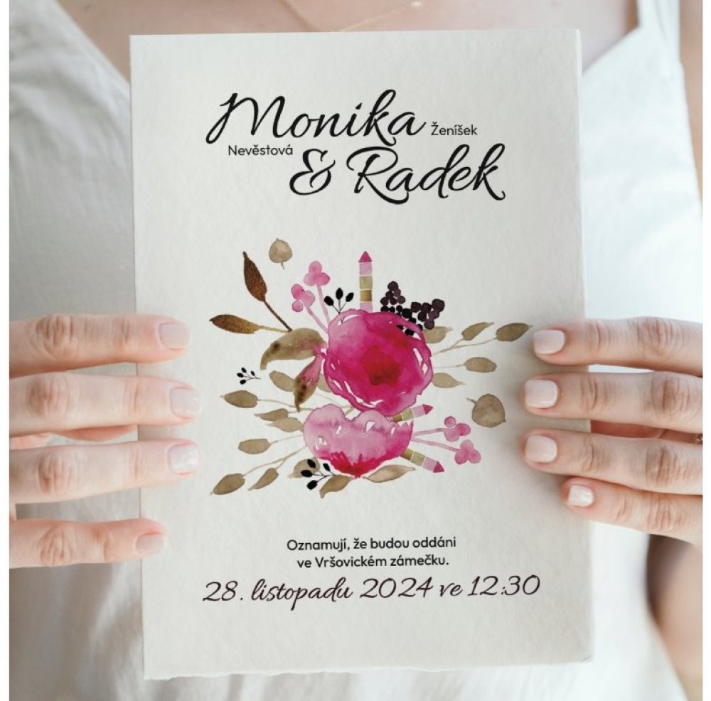 Naše svatební oznámení vám umožní stylově oznámit váš velký den. Tiskneme je na kvalitní papír s gramáží 250 g/m², který zajistí, že vaše oznámení zanechá nezapomenutelný dojem. Vybírat můžete z mnoha designů – od klasických až po moderní – a snadno je přizpůsobit svým představám. Stačí si zvolit motiv, doplnit osobní údaje, jako jsou jména a datum svatby, a o zbytek se postaráme.