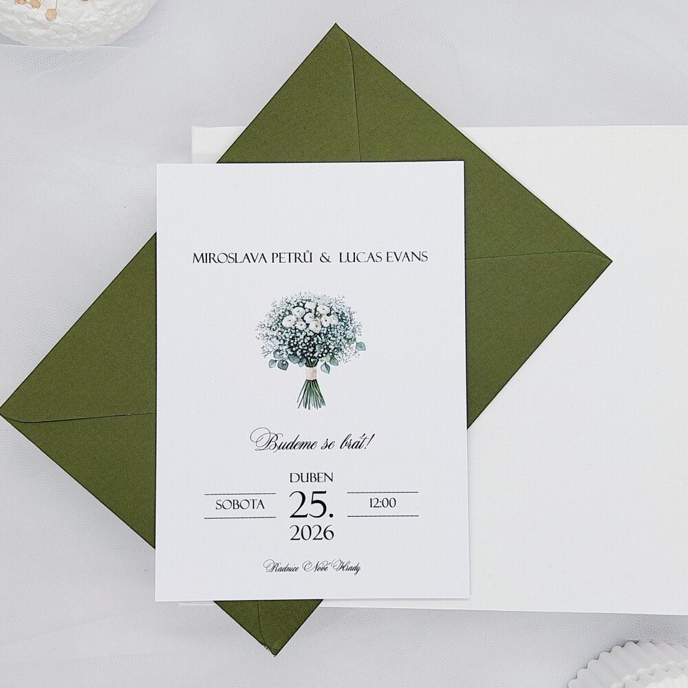 Svatební oznámení do obálky C6 nebo B6. Tiskneme na krásném bílém papíře o gramáži 300 g/m2. Elegantní bílé provedení s motivem jemné kytičky eukalyptu a růží. Oznámení má rozměry cca 10,5 x 14,5 cm.