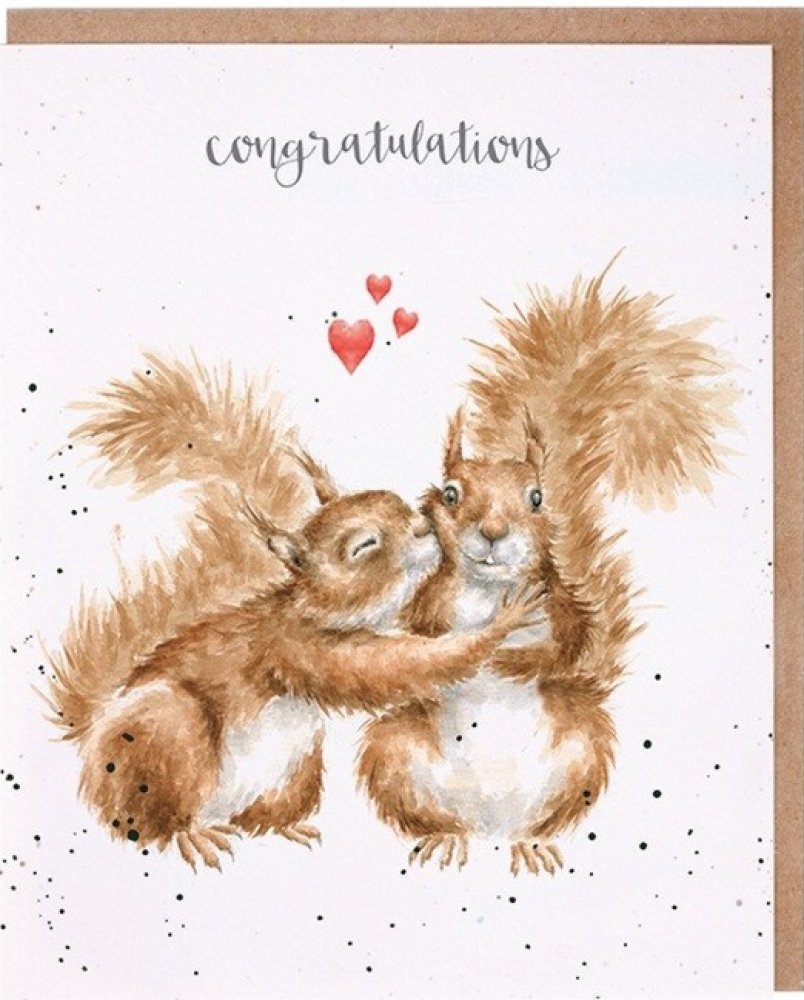 Gratulační přáníčko k sňatku s akvarelovou ilustrací veverčího páru. Uvnitř bez textu s prostorem k zapsání vlastního vzkazu. V balení spolu s recyklovanou kraftovou obálkou, která přání dodává příjemný rustikální dojem. Texturovaný karton pochází z udržitelně spravovaných lesů v Jezerní oblasti Anglie. Rozměr 170 x 138 mm.