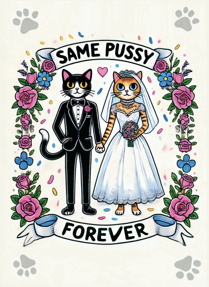 Sladkých, kýčovitých přání je všude milion. Ale tohle přáníčko řekne nahlas pravdu, kterou všichni tuší, ale málokdo ji řekne novomanželům do očí. Na přední straně kočka a kocour ve svatebním a upřímný vzkaz: „SAME PUSSY FOREVER“.